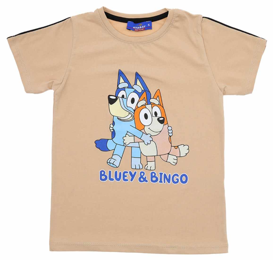 Piękny chłopięcy t-shirt z krótkim rękawem. Jest to klasyczny krój z okrągłym dekoltem. Bluzka jest koloru beżowego, a przód został ozdobiony nadrukiem Blue i Bingo. To model uszyty z przyjemnej, miękkiej dzianiny, ładnie się uciąga, dzięki czemu dopasowuje się do dziecka i zapewnia mu swobodę ruchów.