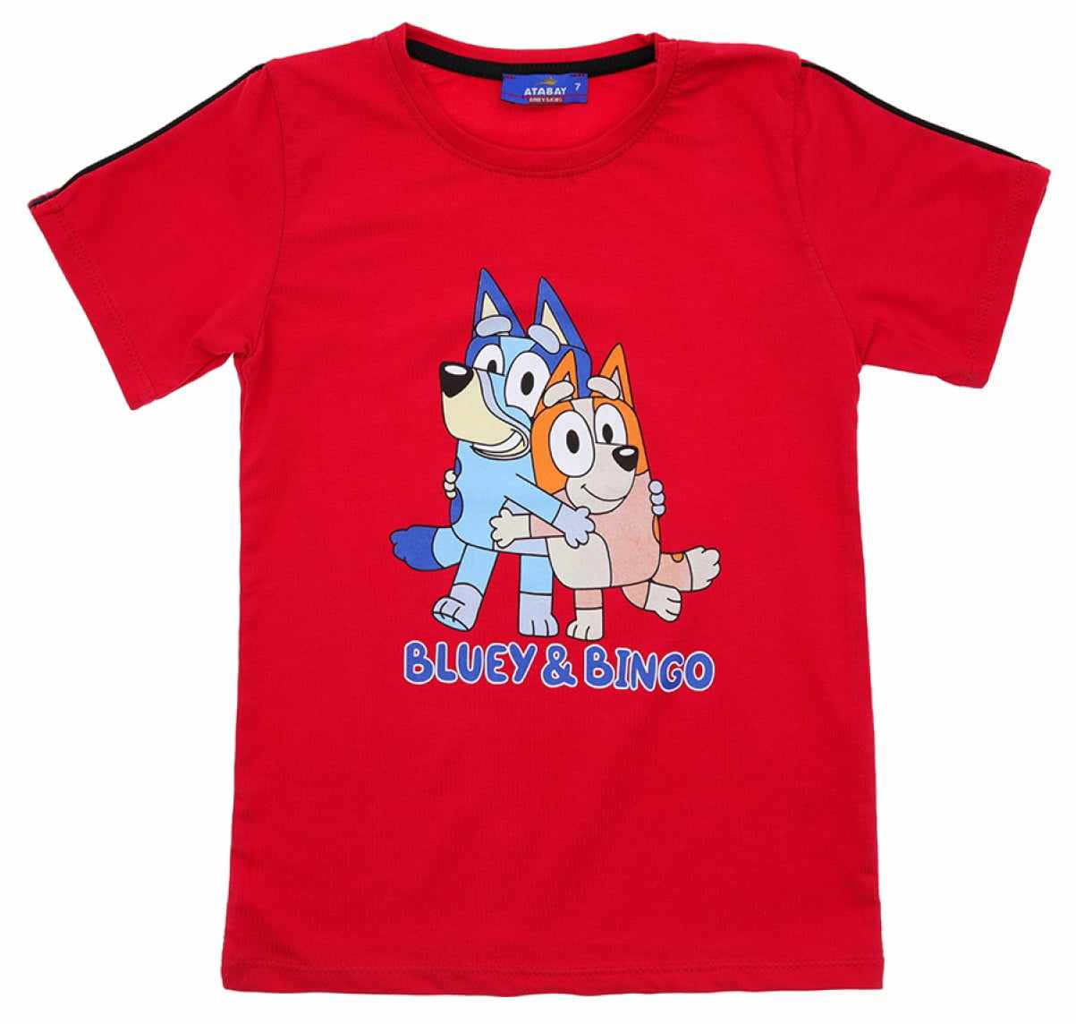 Piękny chłopięcy t-shirt z krótkim rękawem. Jest to klasyczny krój z okrągłym dekoltem. Bluzka jest koloru czerwonego, a przód został ozdobiony nadrukiem Blue i Bingo. To model uszyty z przyjemnej, miękkiej dzianiny, ładnie się uciąga, dzięki czemu dopasowuje się do dziecka i zapewnia mu swobodę ruchów.