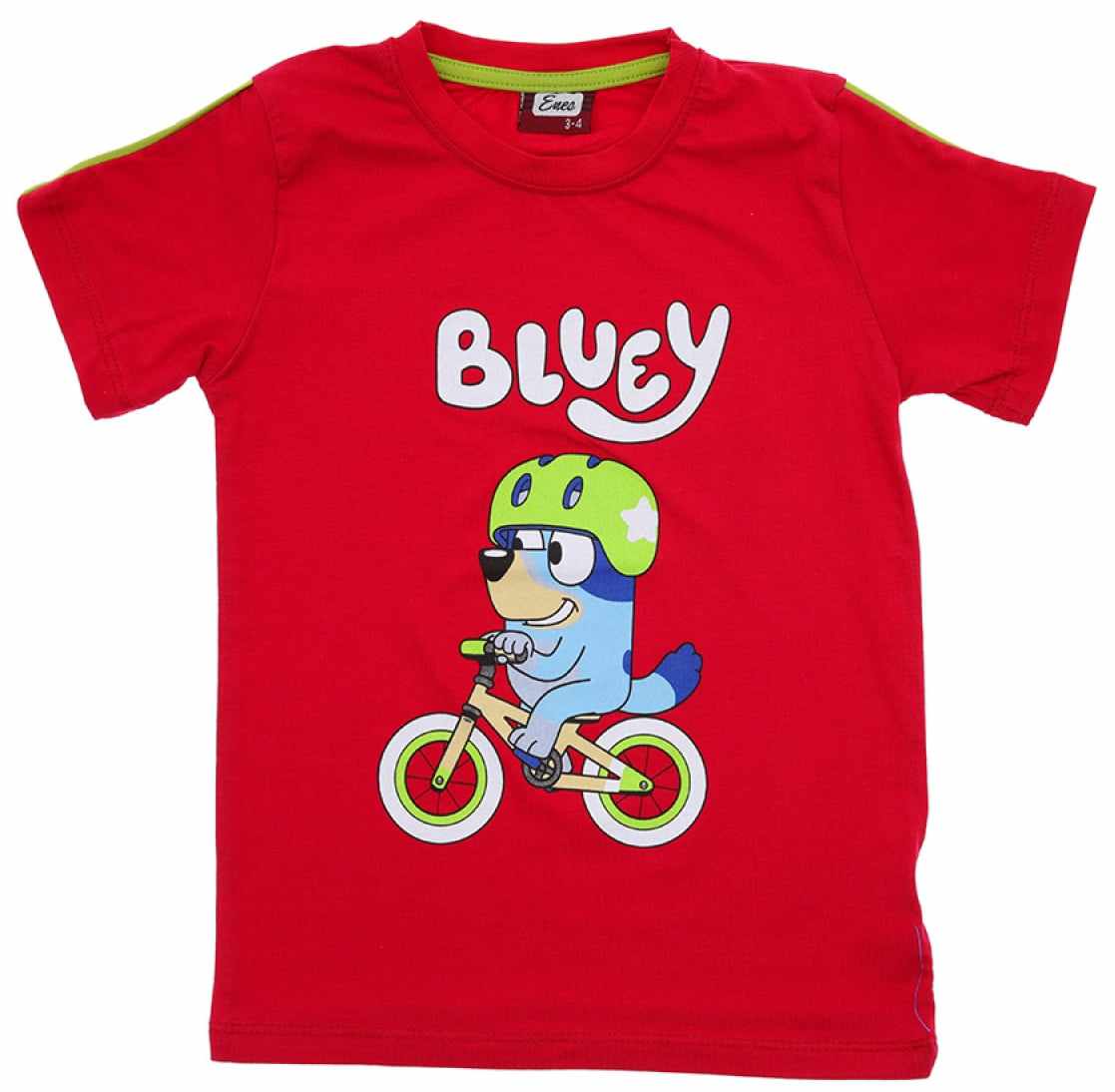 Piękny chłopięcy t-shirt z krótkim rękawem. Jest to klasyczny krój z okrągłym dekoltem. Bluzka jest koloru czerwonego, a przód został ozdobiony nadrukiem Bluey na rowerze. To model uszyty z przyjemnej, miękkiej dzianiny, ładnie się uciąga, dzięki czemu dopasowuje się do dziecka i zapewnia mu swobodę ruchów.