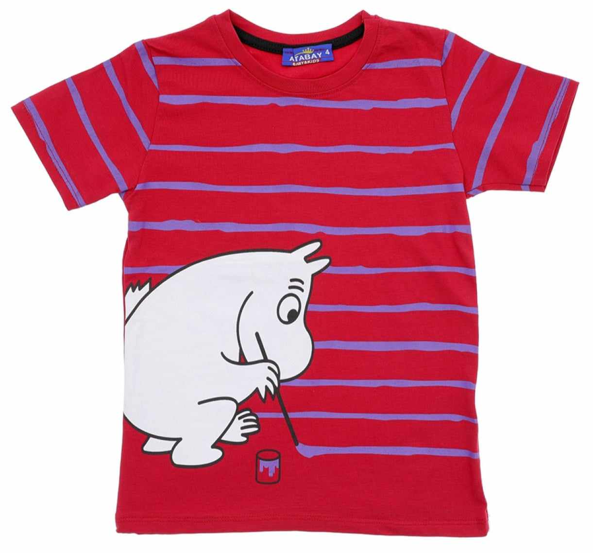 Piękny chłopięcy t-shirt z krótkim rękawem. Jest to klasyczny krój z okrągłym dekoltem. Bluzka jest koloru czerwonego, a przód został ozdobiony nadrukiem Muminka malującego paski. To model uszyty z przyjemnej, miękkiej dzianiny, ładnie się uciąga, dzięki czemu dopasowuje się do dziecka i zapewnia mu swobodę ruchów.
