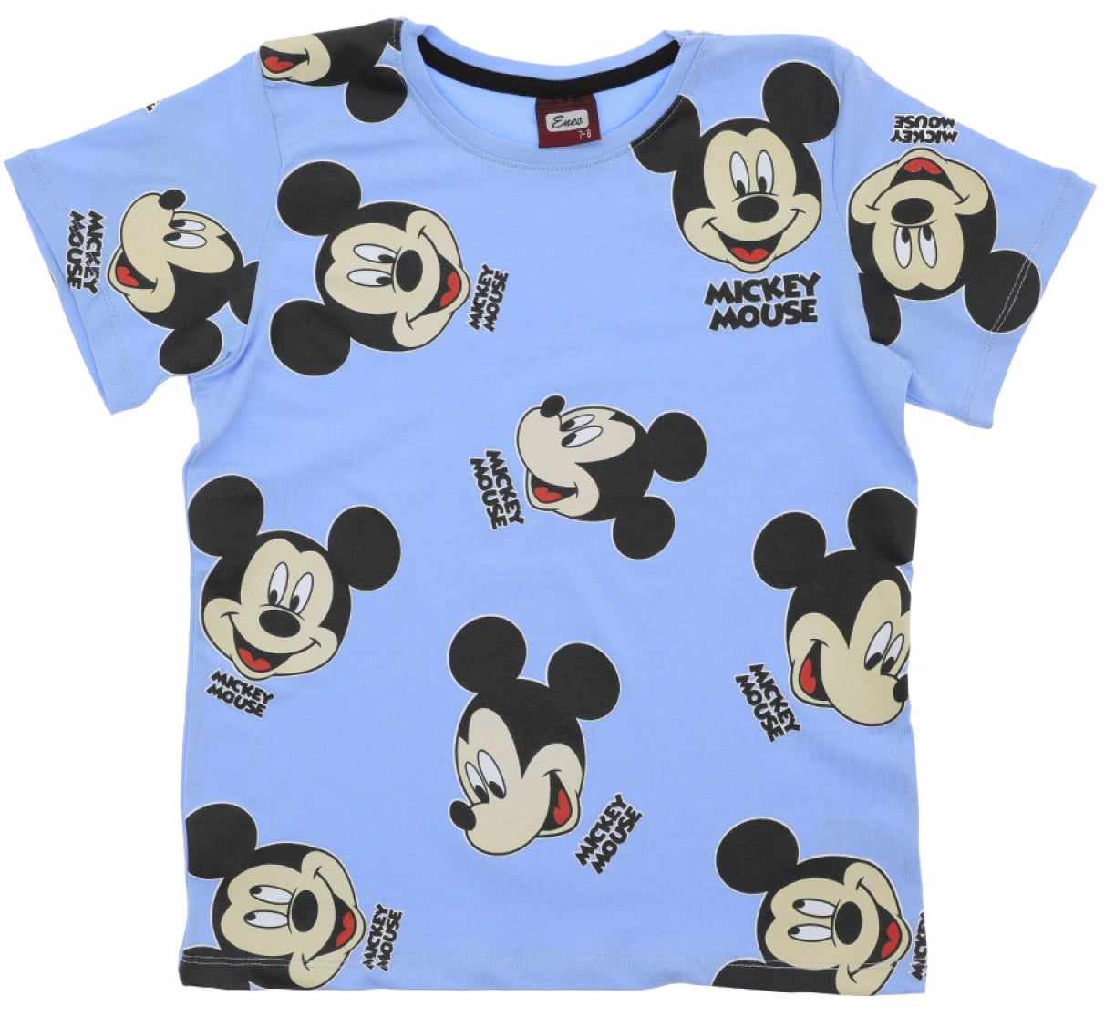 Piękny chłopięcy t-shirt z krótkim rękawem. Jest to klasyczny krój z okrągłym dekoltem. Bluzka jest koloru niebieskiego, a przód został ozdobiony nadrukami Myszki Miki. To model uszyty z przyjemnej, miękkiej dzianiny, ładnie się uciąga, dzięki czemu dopasowuje się do dziecka i zapewnia mu swobodę ruchów.