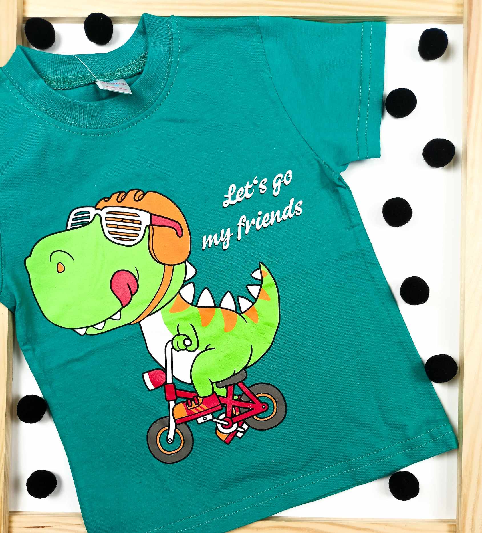 Piękny chłopięcy t-shirt z krótkim rękawem dla fanów dinozaurów. Jest to klasyczny krój z okrągłym dekoltem. Bluzka jest koloru morskiego, a przód został ozdobiony nadrukiem dinozaura na rowerze. To model uszyty z przyjemnej, miękkiej dzianiny, zapewnia dziecku swobodę ruchów.