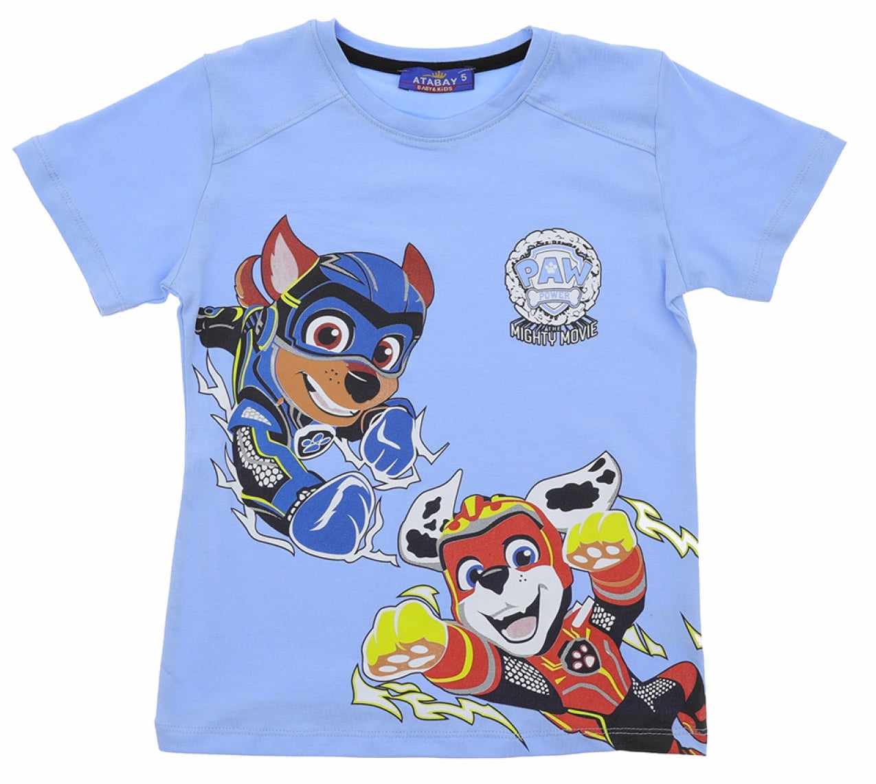 Piękny chłopięcy t-shirt z krótkim rękawem dla fanów bajki Psi Patrol. Jest to klasyczny krój z okrągłym dekoltem. Bluzka jest koloru niebieskiego, a przód został ozdobiony nadrukiem Chase-a i Marshall-a. To model uszyty z przyjemnej, miękkiej dzianiny, ładnie się uciąga, dzięki czemu dopasowuje się do dziecka i zapewnia mu swobodę ruchów.