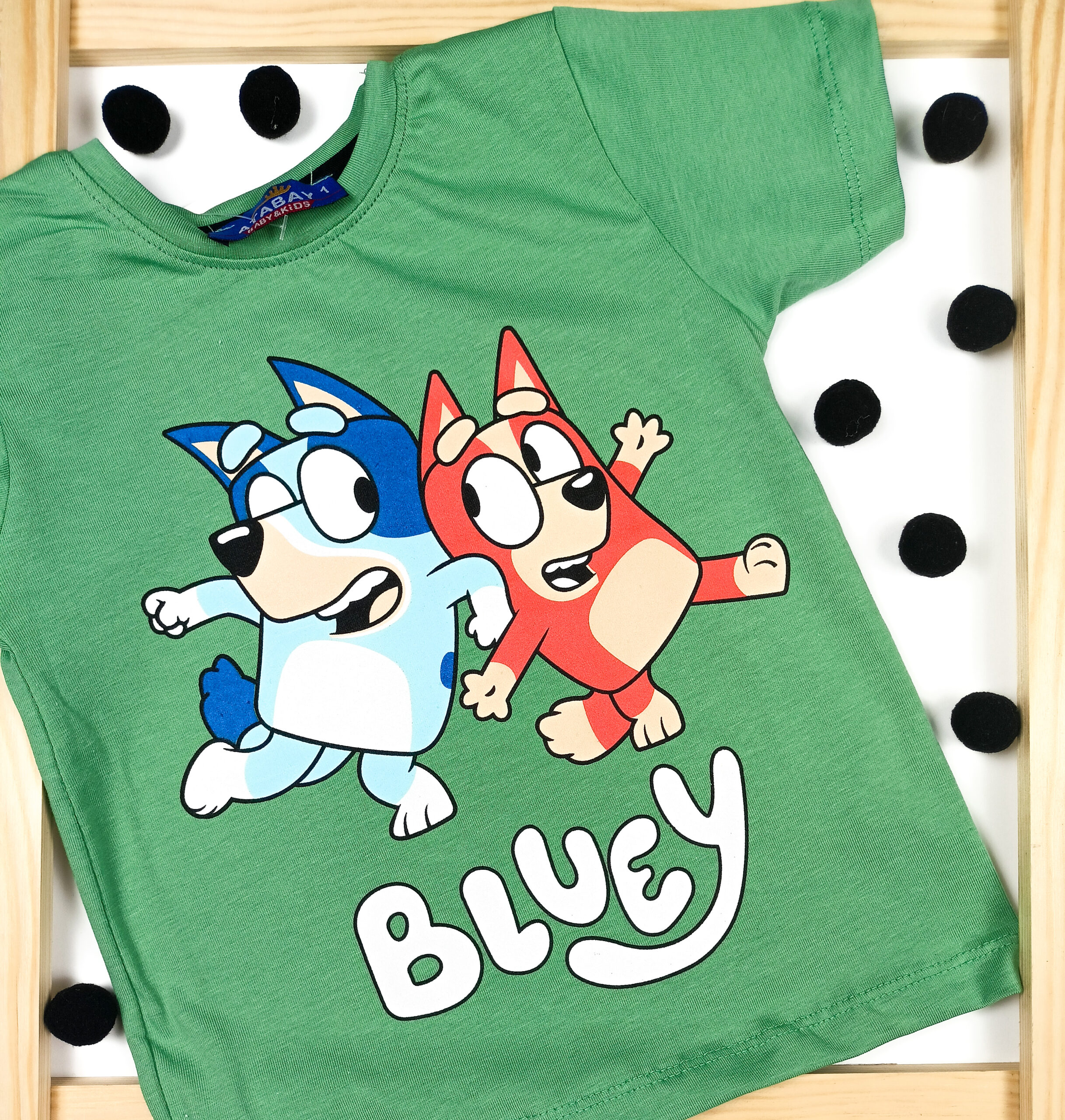 Piękny chłopięcy t-shirt z krótkim rękawem. Jest to klasyczny krój z okrągłym dekoltem. Bluzka jest koloru zielonego, a przód został ozdobiony nadrukiem Blue i Bingo. To model uszyty z przyjemnej, miękkiej dzianiny, ładnie się uciąga, dzięki czemu dopasowuje się do dziecka i zapewnia mu swobodę ruchów.