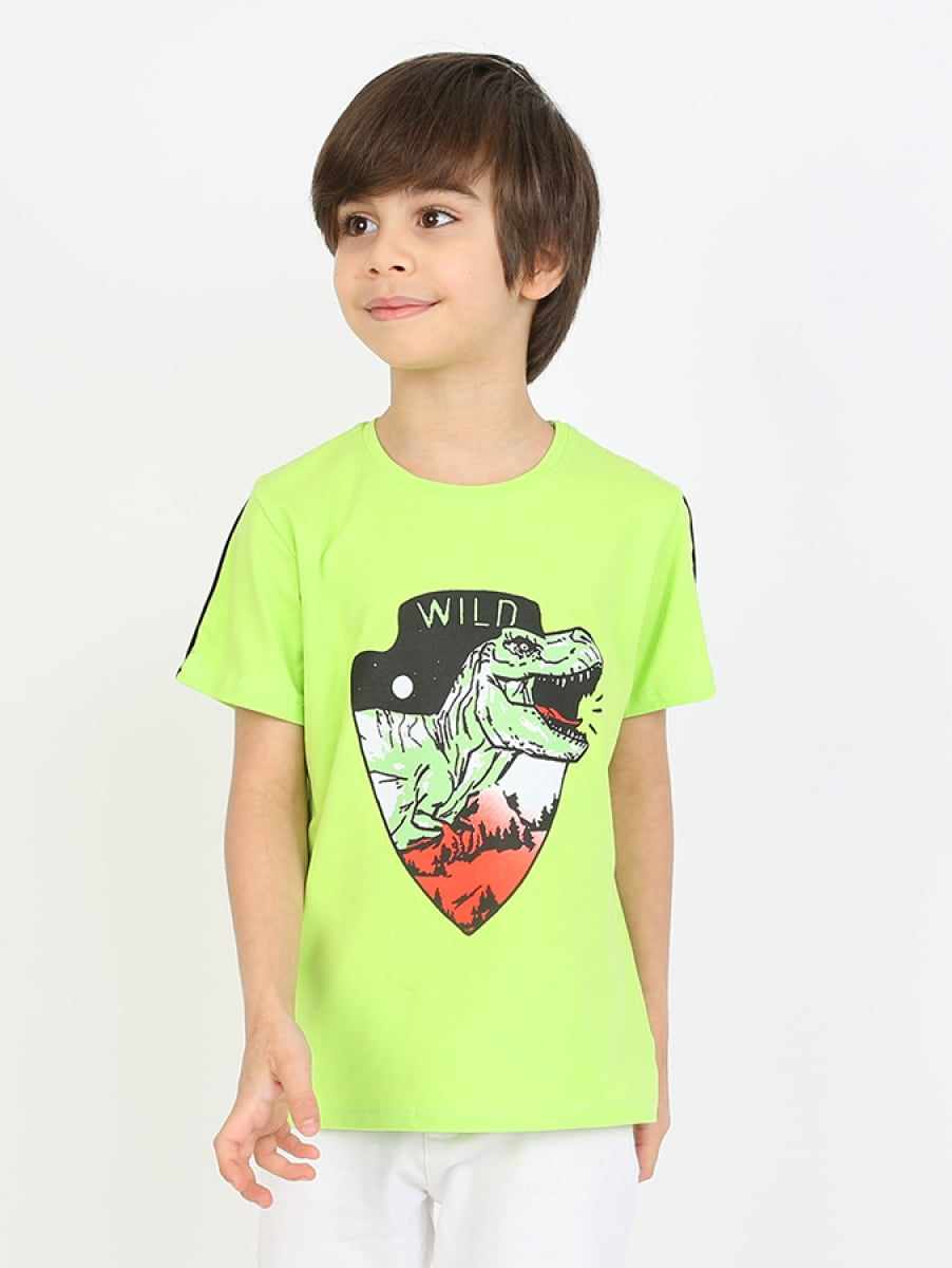 Piękny chłopięcy t-shirt z krótkim rękawem dla fanów dinozaurów. Jest to klasyczny krój z okrągłym dekoltem. Bluzka jest koloru zielonego, a przód został ozdobiony nadrukiem dinozaura. To model uszyty z przyjemnej, miękkiej dzianiny, ładnie się uciąga, dzięki czemu dopasowuje się do dziecka i zapewnia mu swobodę ruchów.