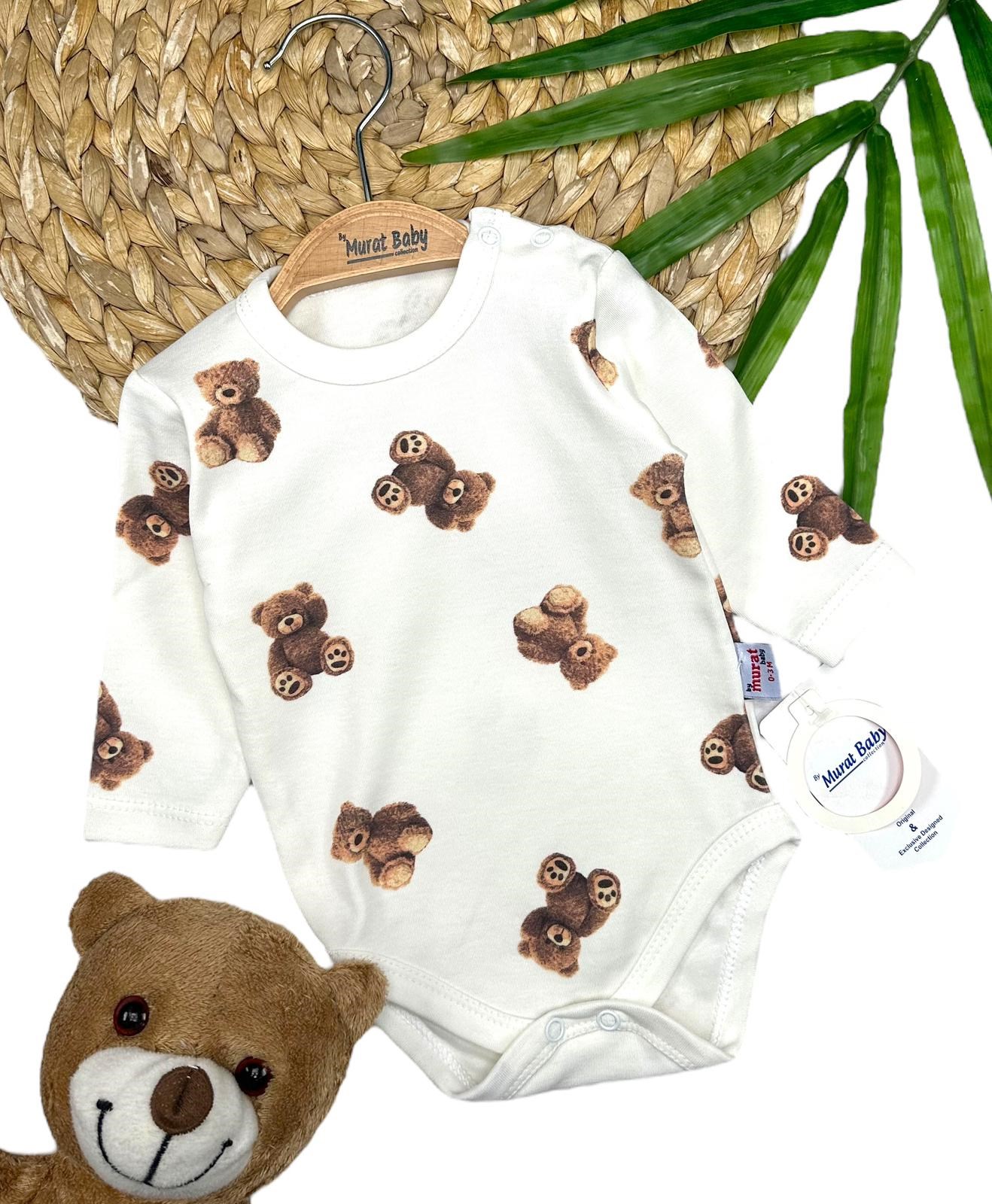 Urocze body niemowlęce z długim rękawem w kolorze śmietankowym. Body posiadają zapinanie na napki przy szyjce i w kroczku. Oryginalności dodaje im nadruk misiów. Body zapewnią dziecku wygodę, komfort i mogą być z powodzeniem stosowane jako baza do innych stylizacji. Nie może ich zabraknąć w garderobie maluszka! To model uszyty z przyjemnej, miękkiej bawełny, nie krępującej ruchów dziecka.
