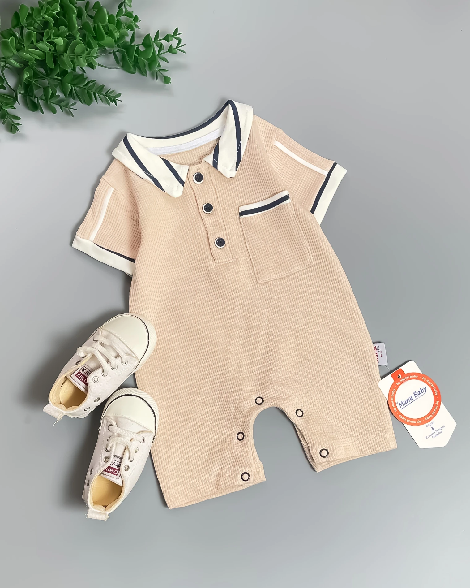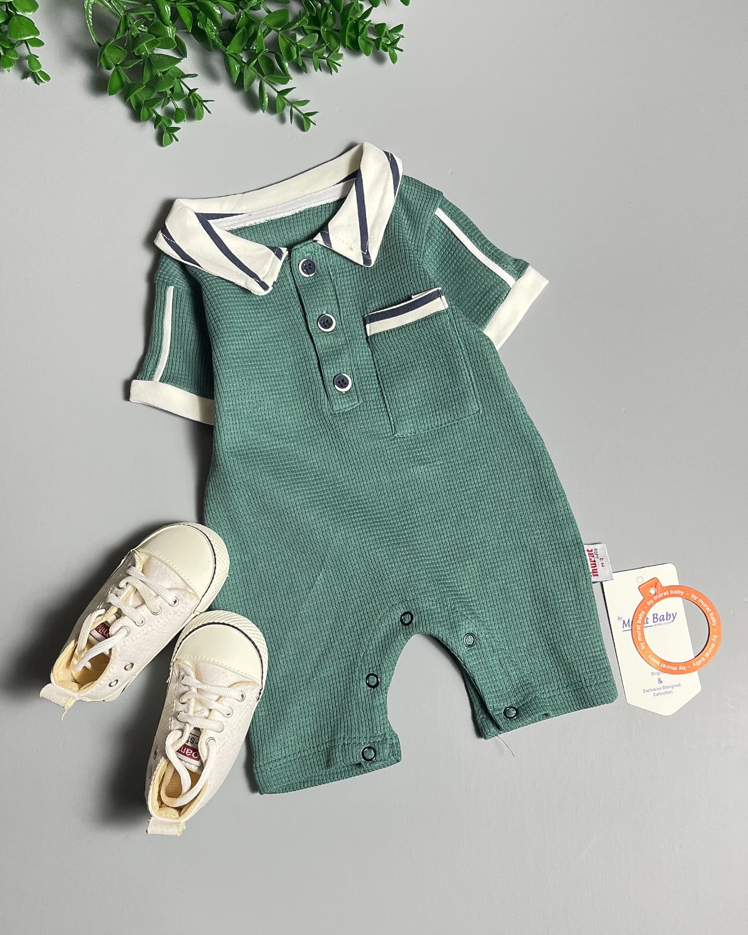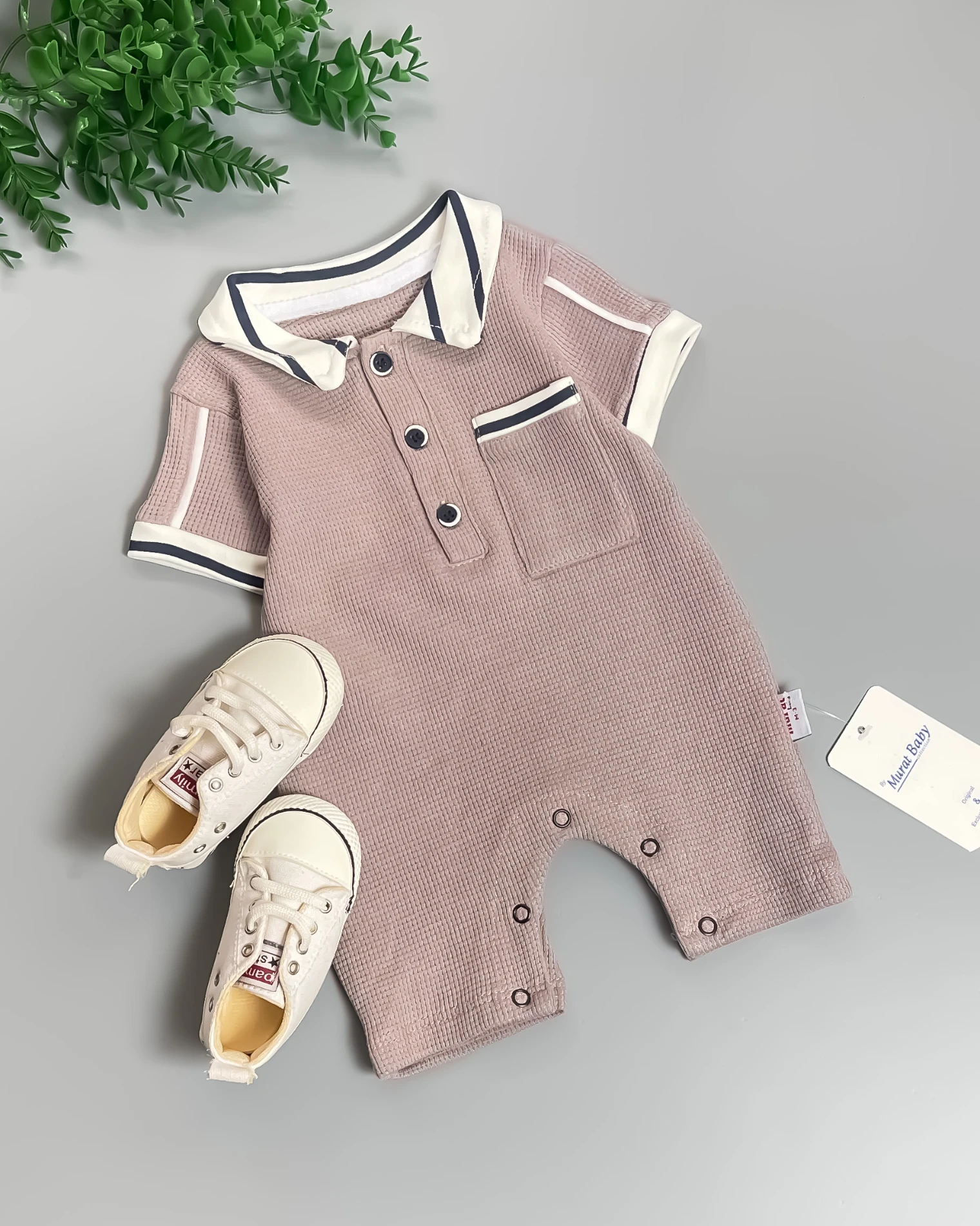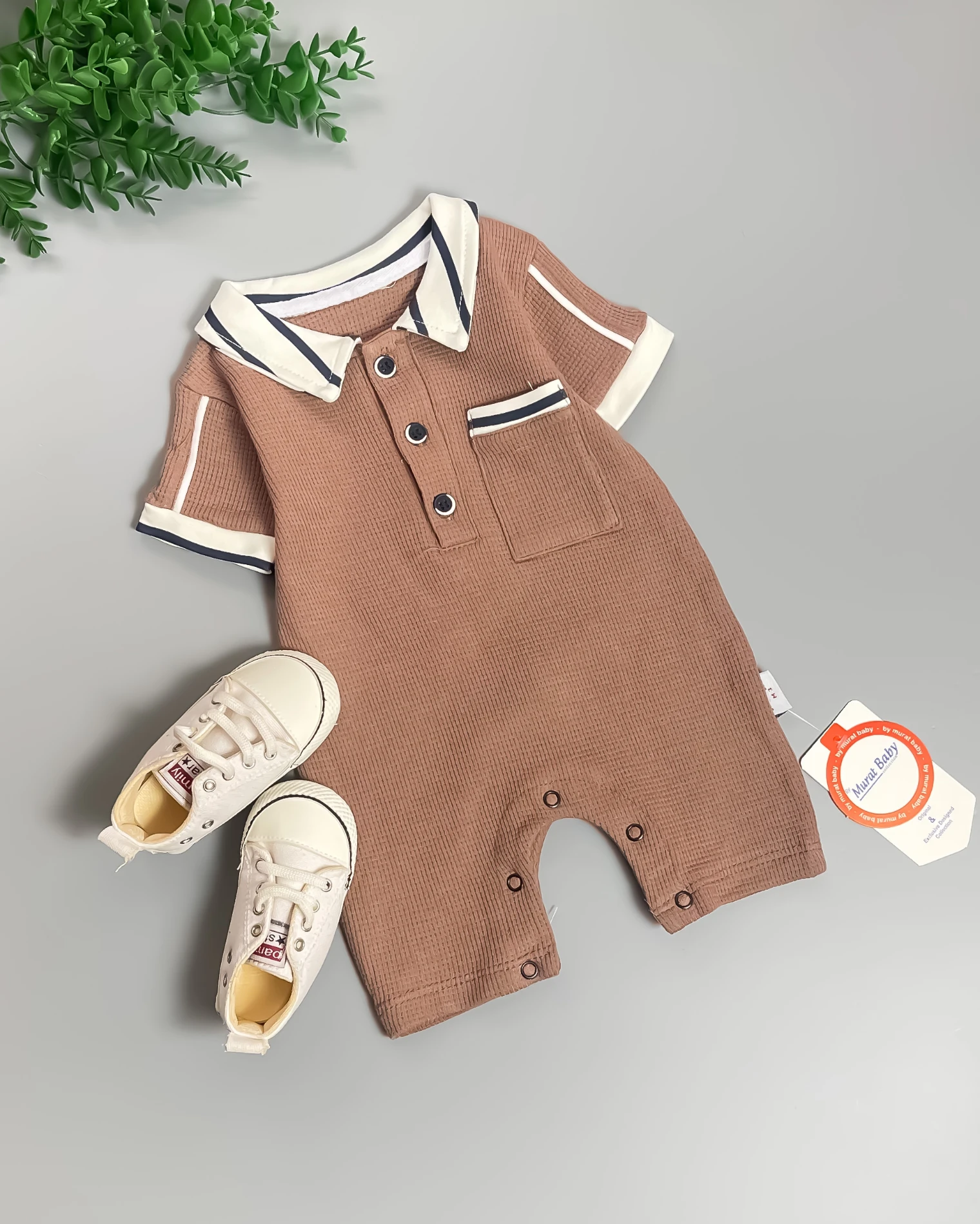 Uroczy rampers niemowlęcy w czterech wariantach kolorystycznych: brązowy, szary, morski zielony i jasny beżowy. Rampers posiada krótki rękaw i krótkie nogawki. Niezwykłego uroku dodaje mu kołnierzyk i wykończenie rękawków w paski. Rampers bardzo łatwo się zakłada- praktyczne zapięcie na trzy guziczki od góry i napki po całej długości nogawek pozwalają szybko ubrać maluszka. Oryginalności dodaje mu kieszonka. To model uszyty z miękkiej bawełny typu wafelek, nie krępującej ruchów dziecka.