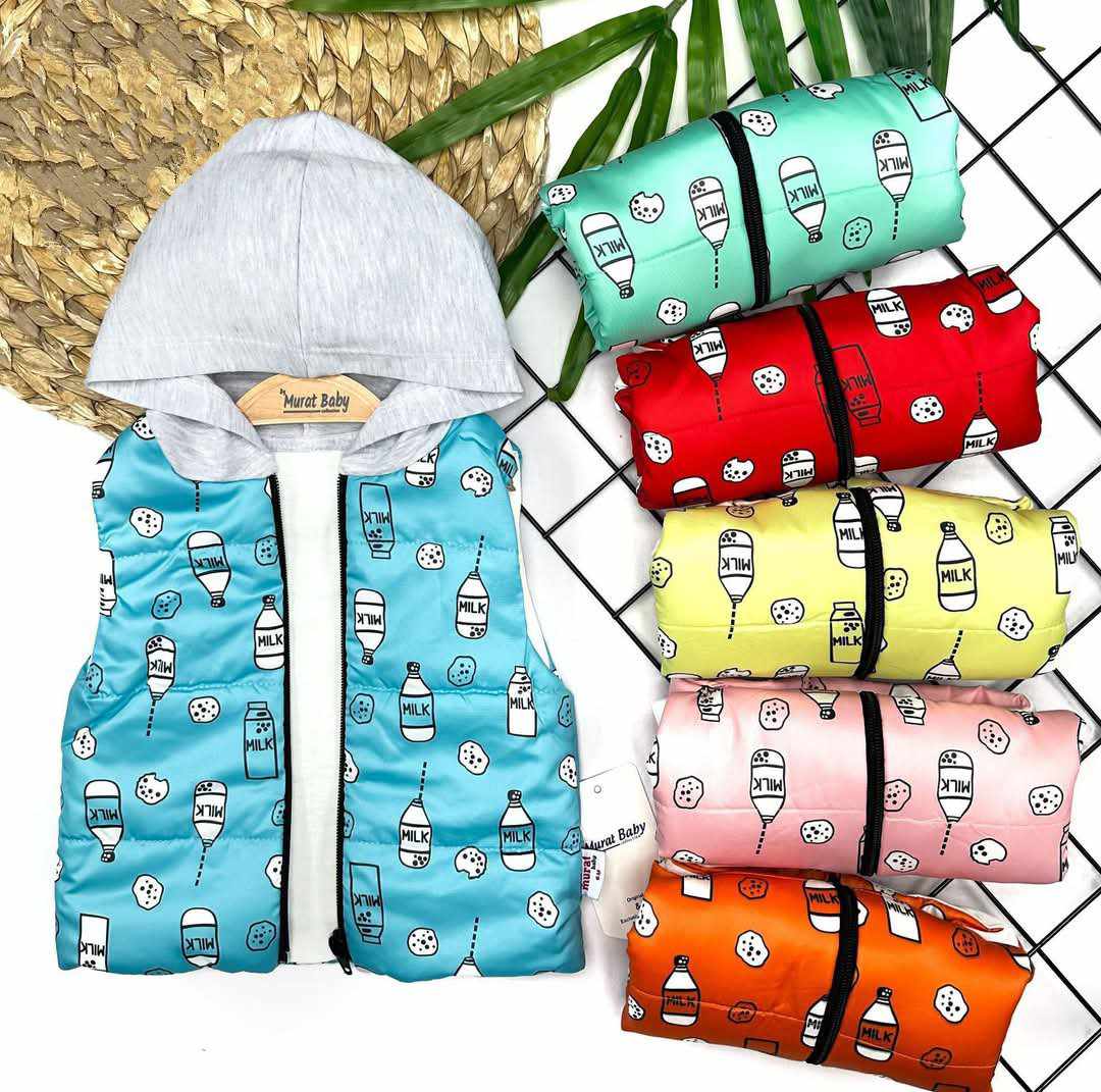 Chłopięca kamizelka z kapturem w pięknym turkusowym kolorku. Kamizelka została uszyta z miłego w dotyku poliestru i bawełny. Bezrękawnik rozpina się na środku, po całości na zamek błyskawiczny. Uroku i stylu dodaje nadruk Milk. Kamizelka sprawdzi się jako wierzchnie ubranko wiosną lub jesienią,