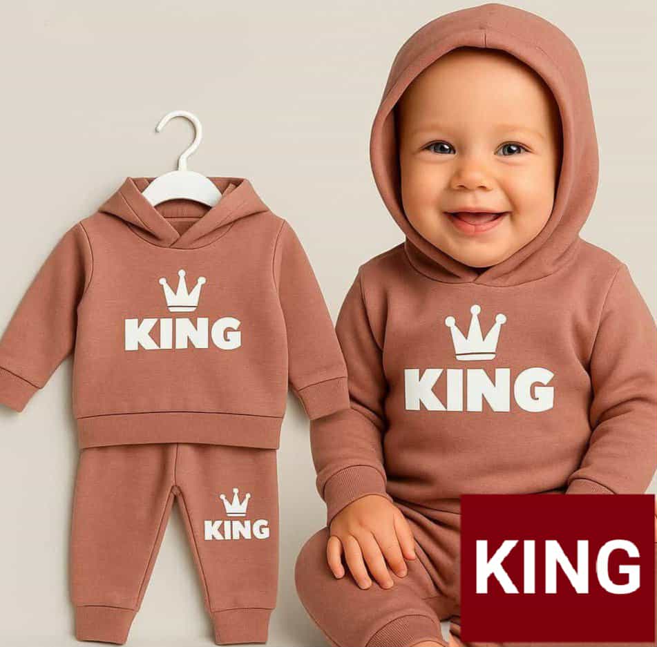 Efektowny dres: bluza+spodnie w kolorze brązowym. Bluza z kapturem wykończona jest ściągaczem na dole i przy rękawkach. Bluza ma klasyczny krój, wkładana jest przez głowę. Spodnie mają  pas w gumkę i ściągacze przy nogawkach. Niezwykłego uroku dodaje nadruk z napisem KING na bluzie i na spodniach.