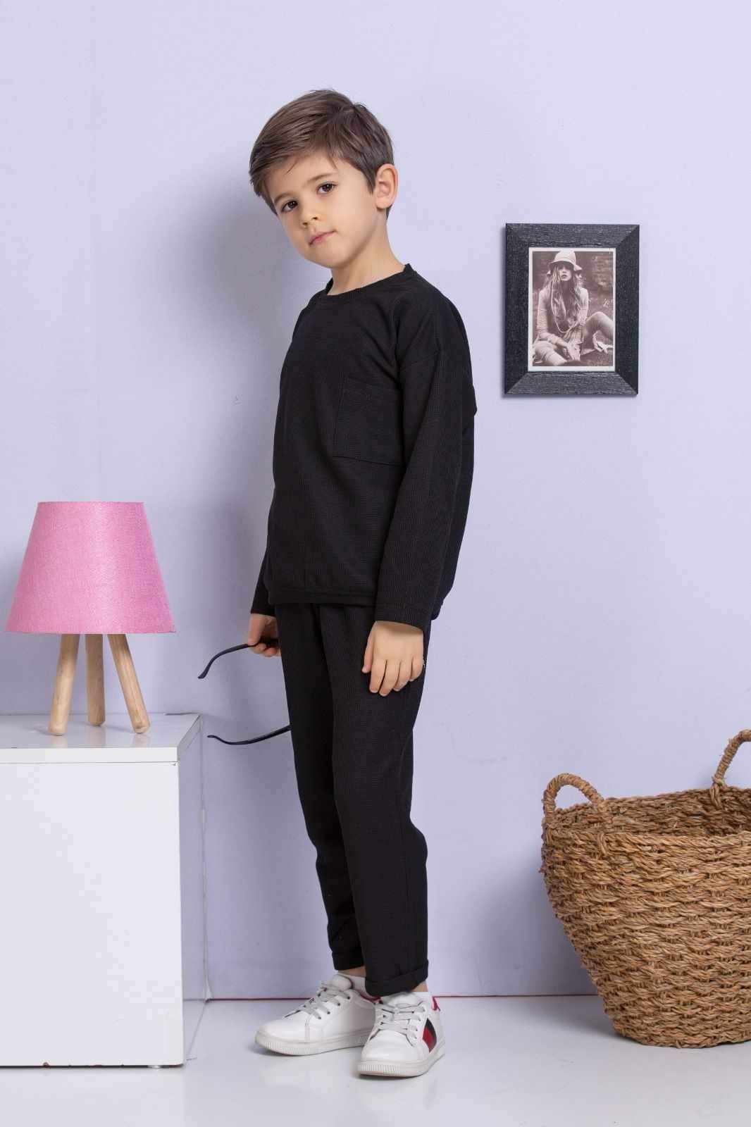 Klasyczny czarny komplet 2-częściowy a'la wafelek. Bluza ma luźny krój i wkładana jest przez głowę. Posiada ściągacz na dole i ozdobną kieszonkę. Spodnie posiadają dwie kieszenie, ściągacz w pasie i dodatkowo sznurek do regulacji, aby spodenki utrzymywały się na swoim miejscu. Nogawka spodni jest prosta, zakończona ozdobnym wywinięciem. To model uszyty z przyjemnej, miękkiej bawełny a'la wafelek, nie krępującej ruchów dziecka.