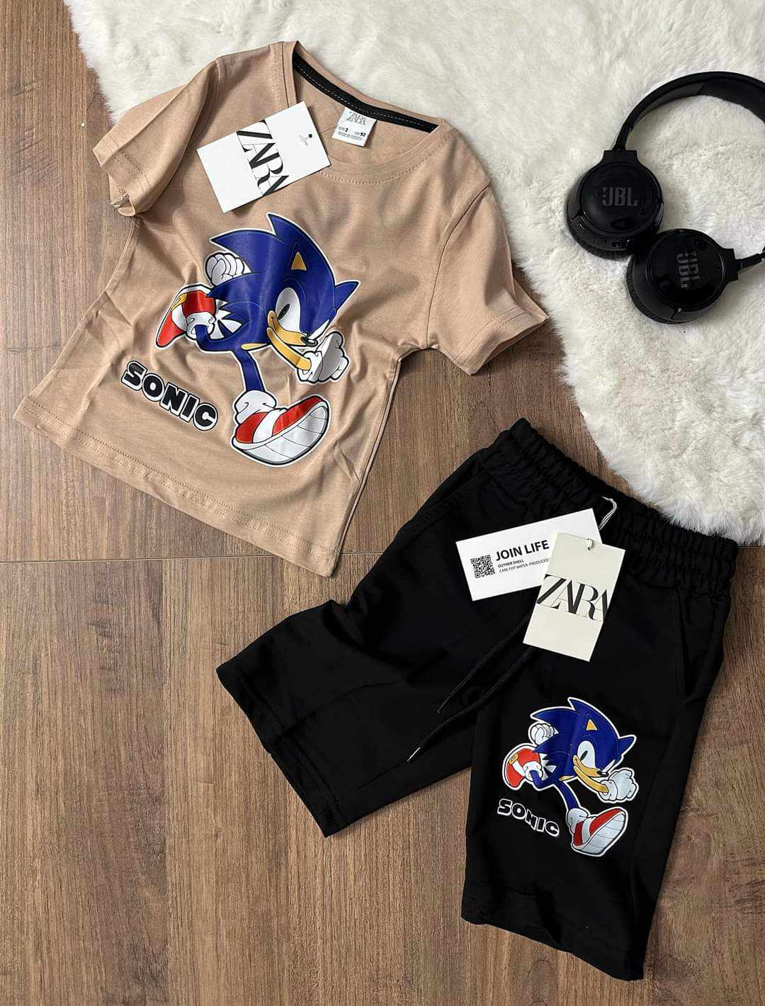 Hitowy chłopięcy komplet dla fanów bajki Sonic. Beżowa bluzka z krótkim rękawem ma klasyczny krój i wkładana jest przez głowę. Czarne spodenki posiadają 2 kieszenie, praktyczną gumkę w pasie i sznurek do regulacji. Uroku całemu kompletowi nadają nadruki SONICa. To model uszyty z przyjemnej, miękkiej bawełny, nie krępującej ruchów dziecka.