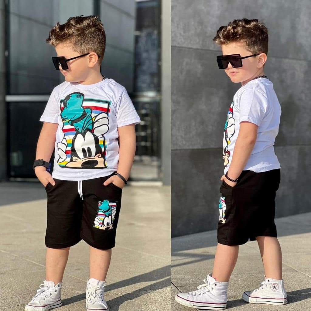 Chłopięcy komplet dla fanów bajek Disneya. W zestawie biały t-shirt z nadrukiem Goofy-ego. Czarne spodenki posiadają dwie praktyczne kieszenie z przodu i nadruk idealnie komponujący się z bluzką. Szeroki pas w gumkę z dodatkową regulacją-sznureczkami. To model uszyty z przyjemnej, miękkiej dzianiny dresowej, nie krępującej ruchów chłopca.