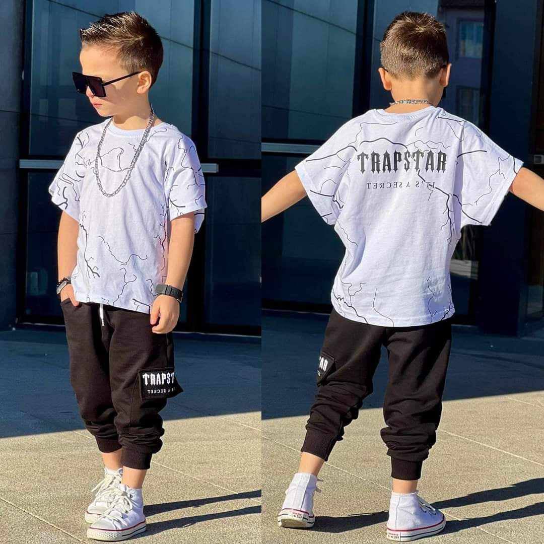 Nietuzinkowy chłopięcy komplet 2-częściowy. W zestawie biały t-shirt z krótkim rękawem. Bluzeczka ma krój OVER/nietoperz- szeroka u góry. Oryginalności bluzce dodają nadruki z przodu i z tyłu. Czarne spodnie posiadają dwie praktyczne kieszenie z przodu, kieszeń z boku z nadrukiem TRAPSTAR i nogawki ze ściągaczami. Szeroki pas w gumkę z dodatkową regulacją-sznureczkami. To model uszyty z przyjemnej, miękkiej dzianiny dresowej, nie krępującej ruchów chłopca.