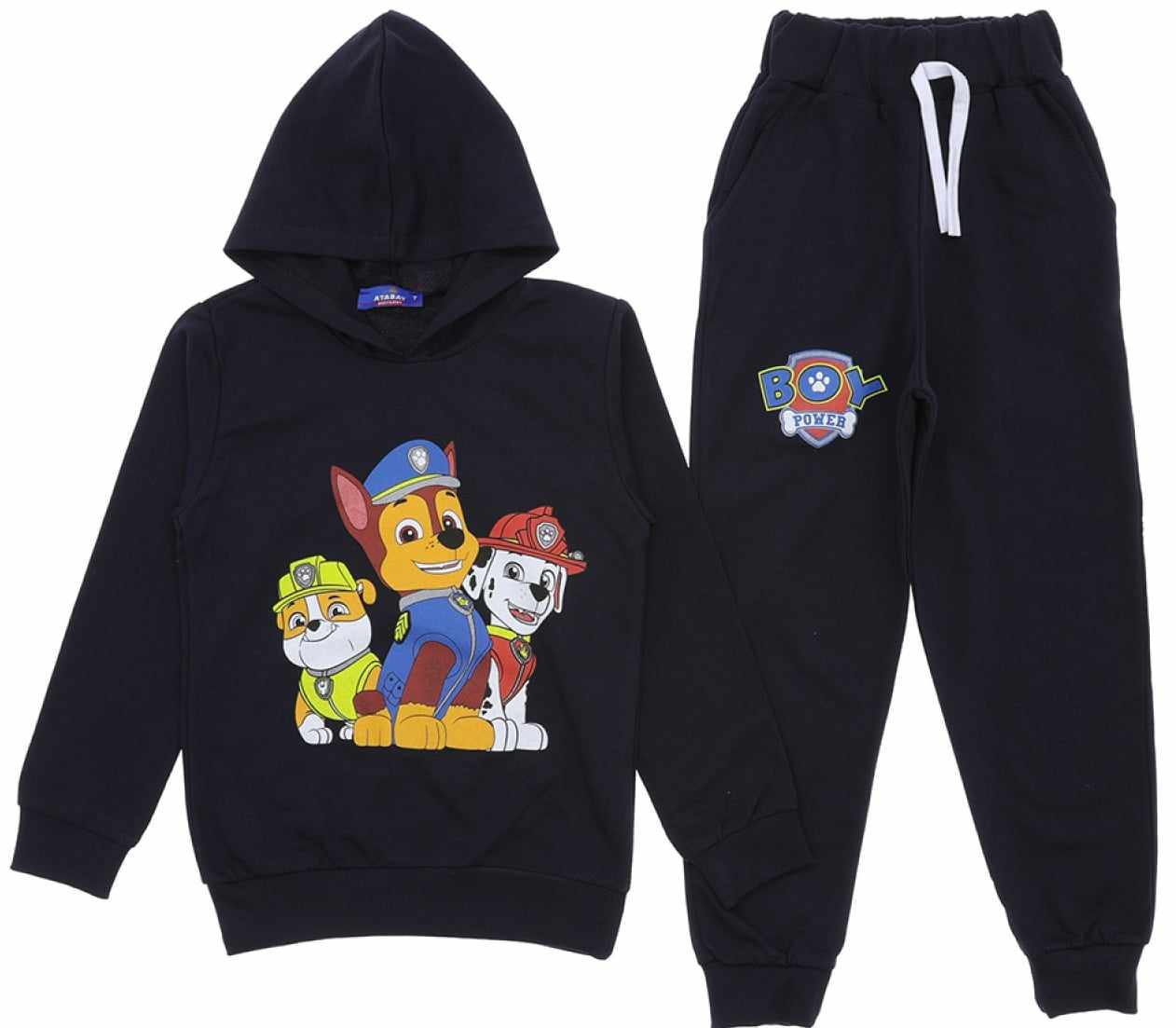 Efektowny dres: bluza+spodnie w kolorze czarnym dla fanów bajki Psi Patrol. Bluza z kapturem wykończona jest ściągaczem na dole i przy rękawkach. Bluza ma klasyczny krój, wkładana jest przez głowę. Spodnie posiadają dwie kieszenie, nogawki ze ściągaczami i pas w gumkę, aby spodenki utrzymywały się na swoim miejscu. To model uszyty z przyjemnej, miękkiej bawełny, nie krępującej ruchów dziecka.