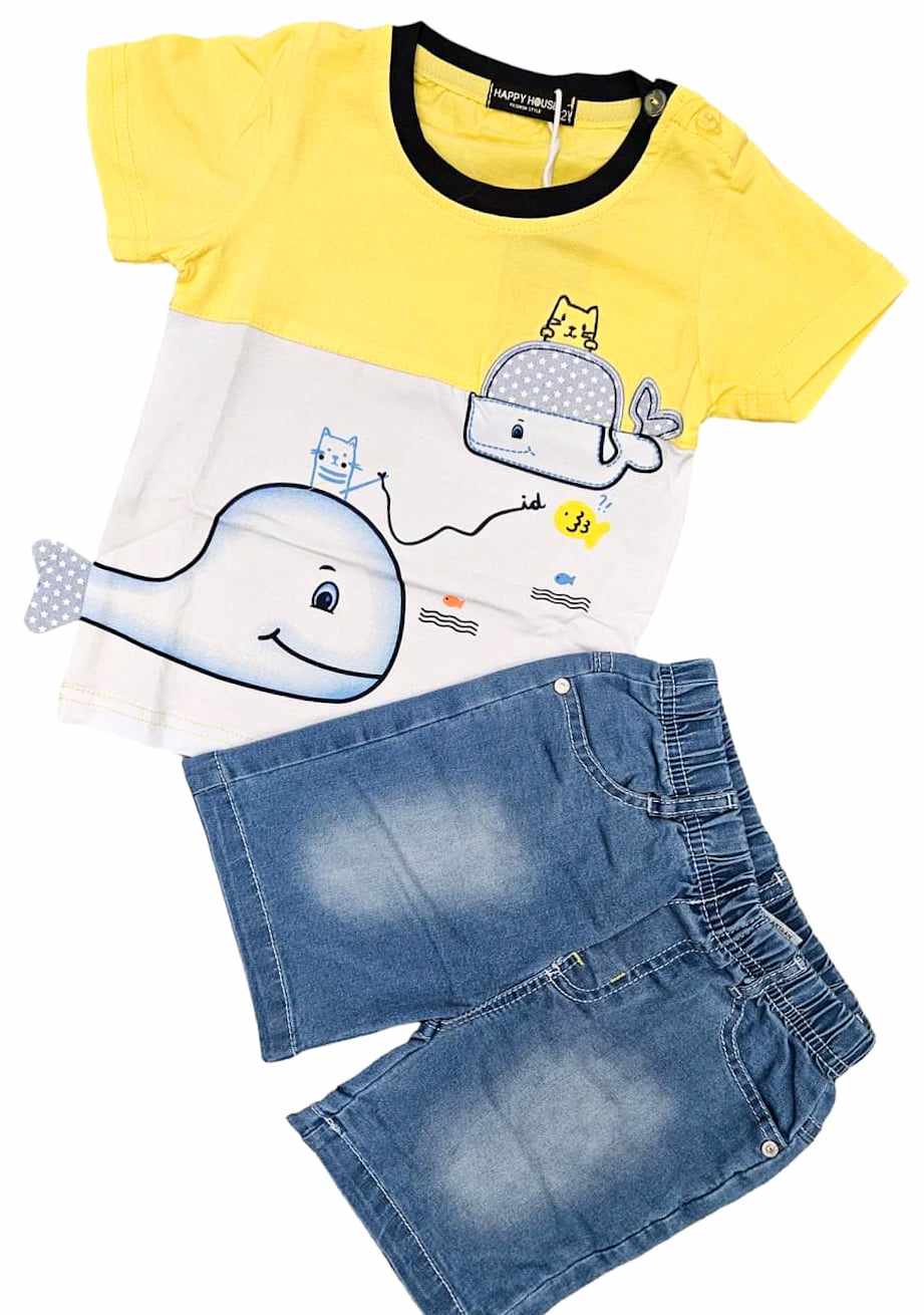 Śliczny chłopięcy komplet: t-shirt+spodenki jeansowe. W zestawie biało-żółta bluzka z krótkim rękawem z nadrukiem wielorybów i wystającą płetwą jednego z nich. T-shirt posiada zapinanie na guziki przy szyjce. Niebieskie spodenki/szorty jeansowe posiadają dwie kieszenie, imitację rozporka i ozdobne wytarcia. W pasie posiadają wygodny, szeroki ściągacz. Świetny zestaw!