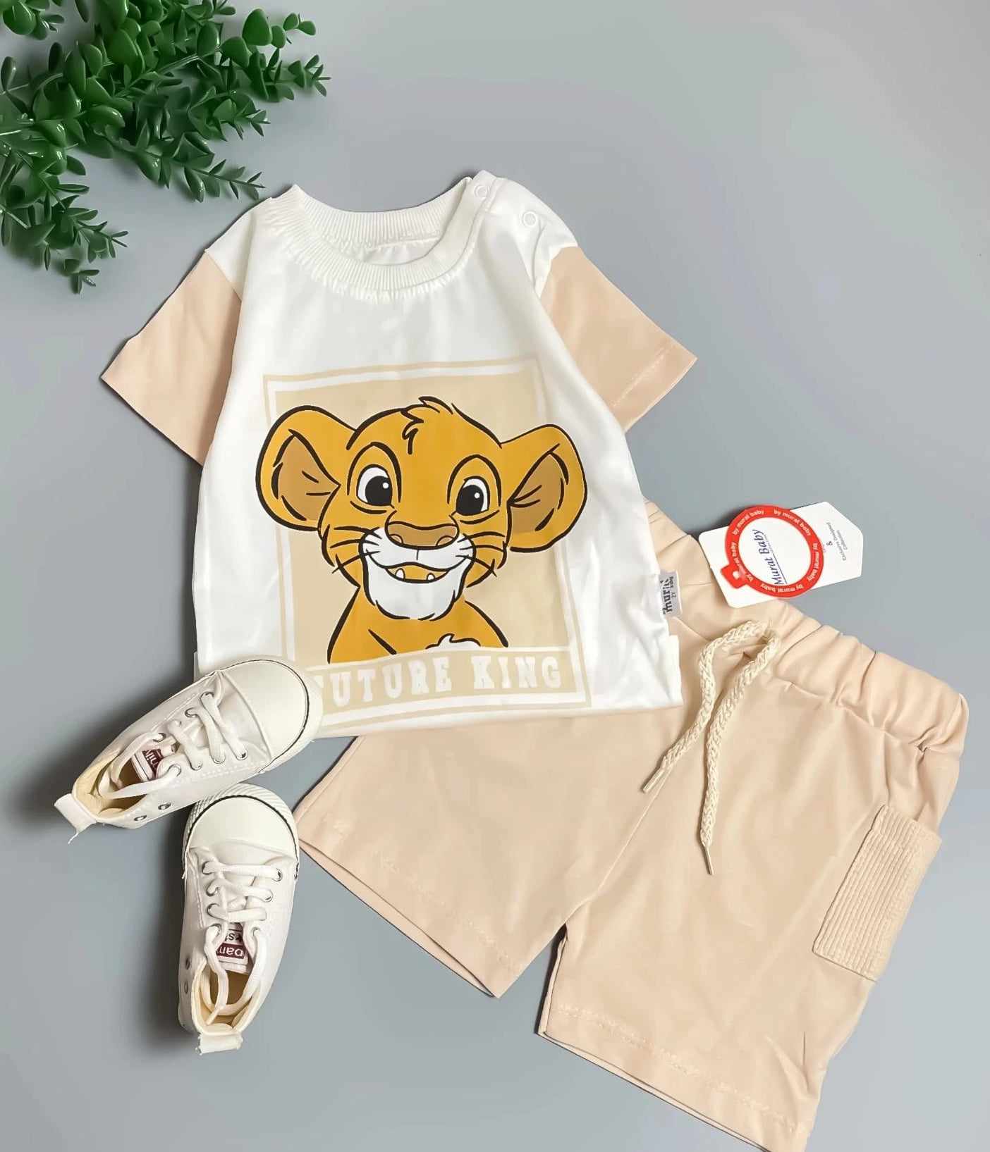 Letni, przewiewny komplet 2-częściowy dla fanów bajki Król Lew. W zestawie śmietankowa bluzka z krótkim rękawem z nadrukiem Simby w okienku. T-shirt posiada zapinanie na napki przy szyjce i beżowe rękawki, które idealnie łączą się ze spodenkami. Gładkie beżowe spodenki posiadają dwie kieszenie po bokach z materiału typu wafelek. Spodenki mają gumkę w pasie, aby utrzymywały się na swoim miejscu. To model uszyty z miękkiej, cienkiej bawełny, nie krępującej ruchów dziecka.