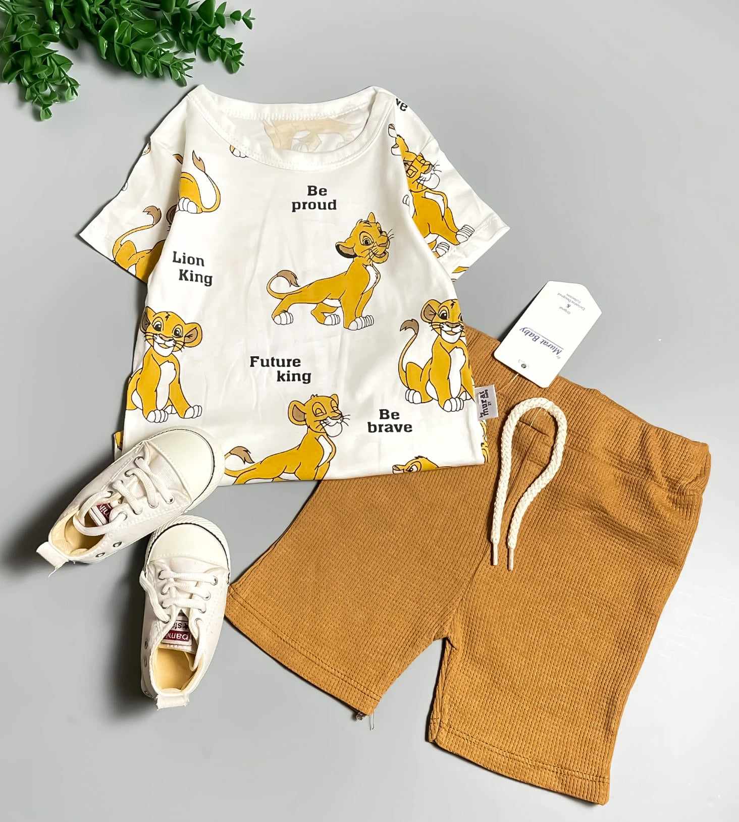 Letni, przewiewny komplet 2-częściowy dla fanów bajki Król Lew. W zestawie śmietankowa bluzka z krótkim rękawem z nadrukiem Simby. Spodenki wykonane z materiału typu wafelek mają pas w gumkę i są w kolorze karmelowym. To model uszyty z miękkiej, cienkiej bawełny, nie krępującej ruchów dziecka.