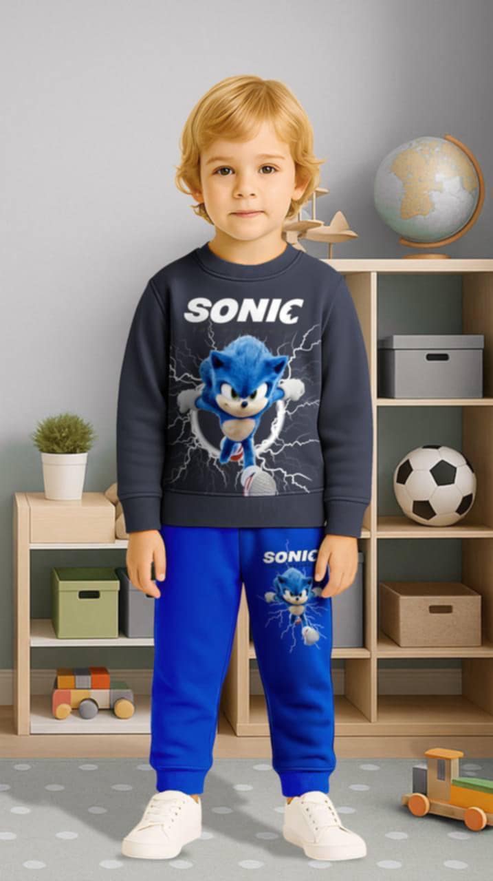 Efektowny chłopięcy komplet: bluza+spodnie. W zestawie grafitowa bluza z nadrukiem SONIC. Bluza ma klasyczny krój i wkładana jest przez głowę. Posiada ściągacz na dole i przy rękawkach. Niebieskie spodnie posiadają nogawki ze ściągaczami, pas w gumkę i nadruk, taki jak na bluzie. To model uszyty z przyjemnej, miękkiej bawełny, nie krępującej ruchów dziecka.