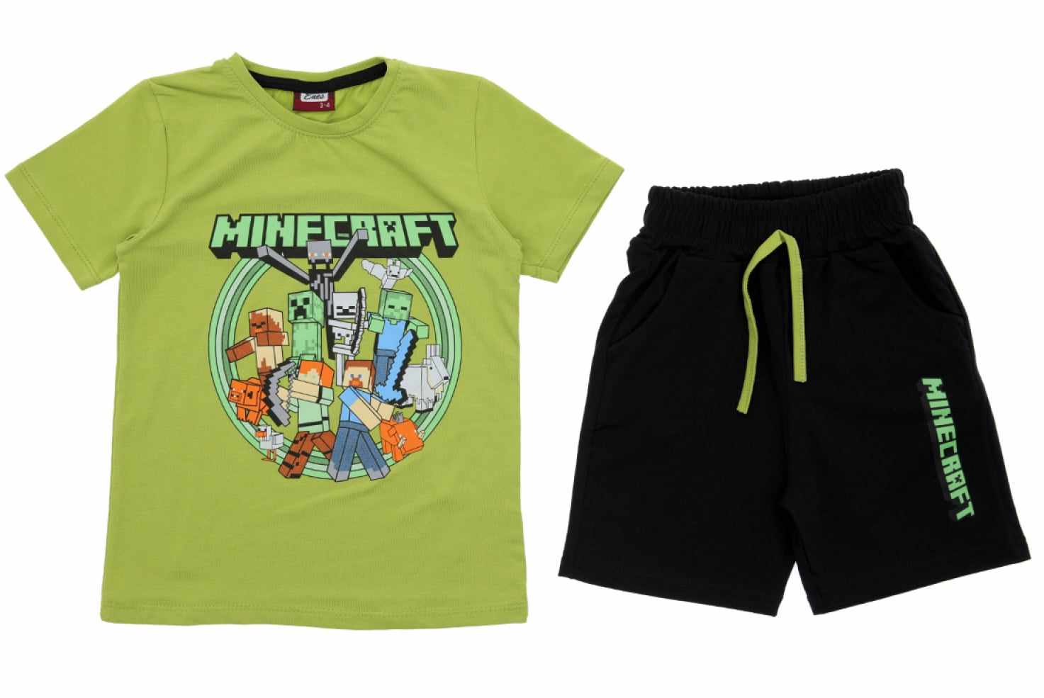 Chłopięcy komplet dla fanów MINECRAFT. W zestawie zielony t-shirt z nadrukiem głównych bohaterów. Czarne spodenki posiadają 2 kieszenie i nadruk MINECRAFT idealnie komponujący się z bluzką. Szeroki pas w gumkę sprawia, że spodenki utrzymują się na swoim miejscu. To model uszyty z przyjemnej, miękkiej bawełny, nie krępującej ruchów chłopca.