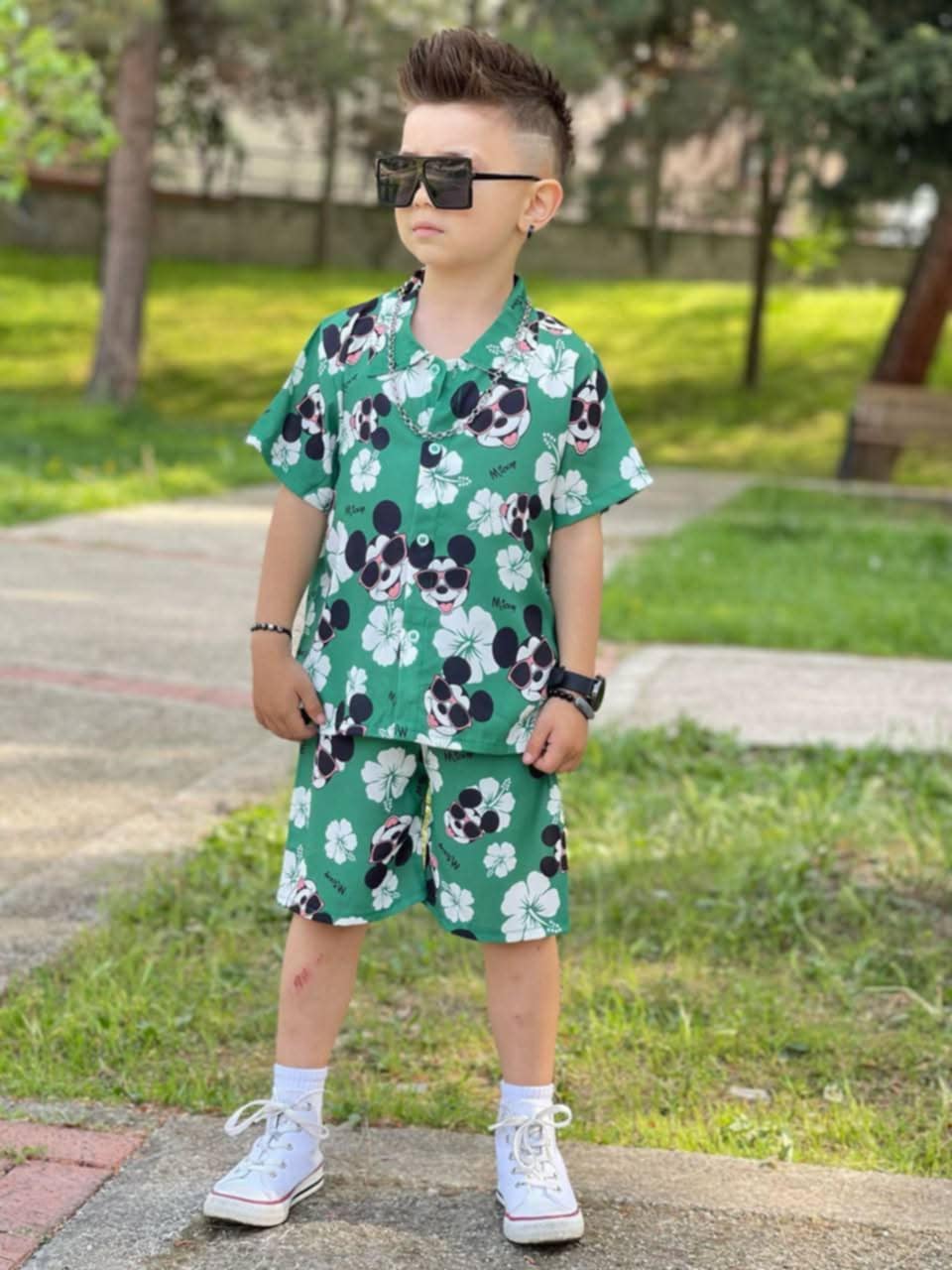 Modny chłopięcy komplet 2-częściowy na czadowe stylówki i wyróżnienie z tłumu. Komplet w kolorze zielonym. Koszula na krótki rękaw zapinana jest na guziki. Wykończona jest kołnierzykiem. Krótkie spodenki posiadają w pasie wygodny, szeroki ściągacz. To model uszyty z przyjemnej bawełny, nie krępującej ruchów chłopca. Ta świetna stylóweczka zachwyci każde oko!