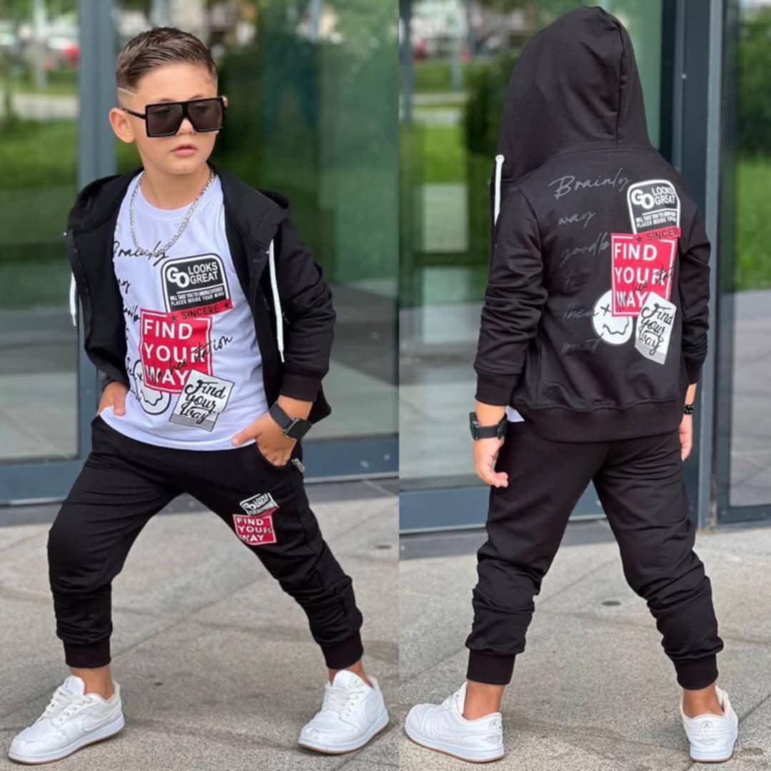 Efektowny chłopięcy komplet 3-częściowy. W zestawie biała bluzka na długi rękaw. Bluza z kapturem zasuwana jest na suwak i posiada kieszenie. Bluza ma ściągacze przy rękawkach i na dole. Spodnie posiadają dwie kieszenie, pas w gumkę i nogawki ze ściągaczami. Szeroki pas w gumkę z dodatkową regulacją-sznureczkami. Uroku całemu kompletowi dodają nadruki na bluzce, bluzie i spodniach. To model uszyty z przyjemnej, miękkiej dzianiny dresowej, nie krępującej ruchów chłopca.