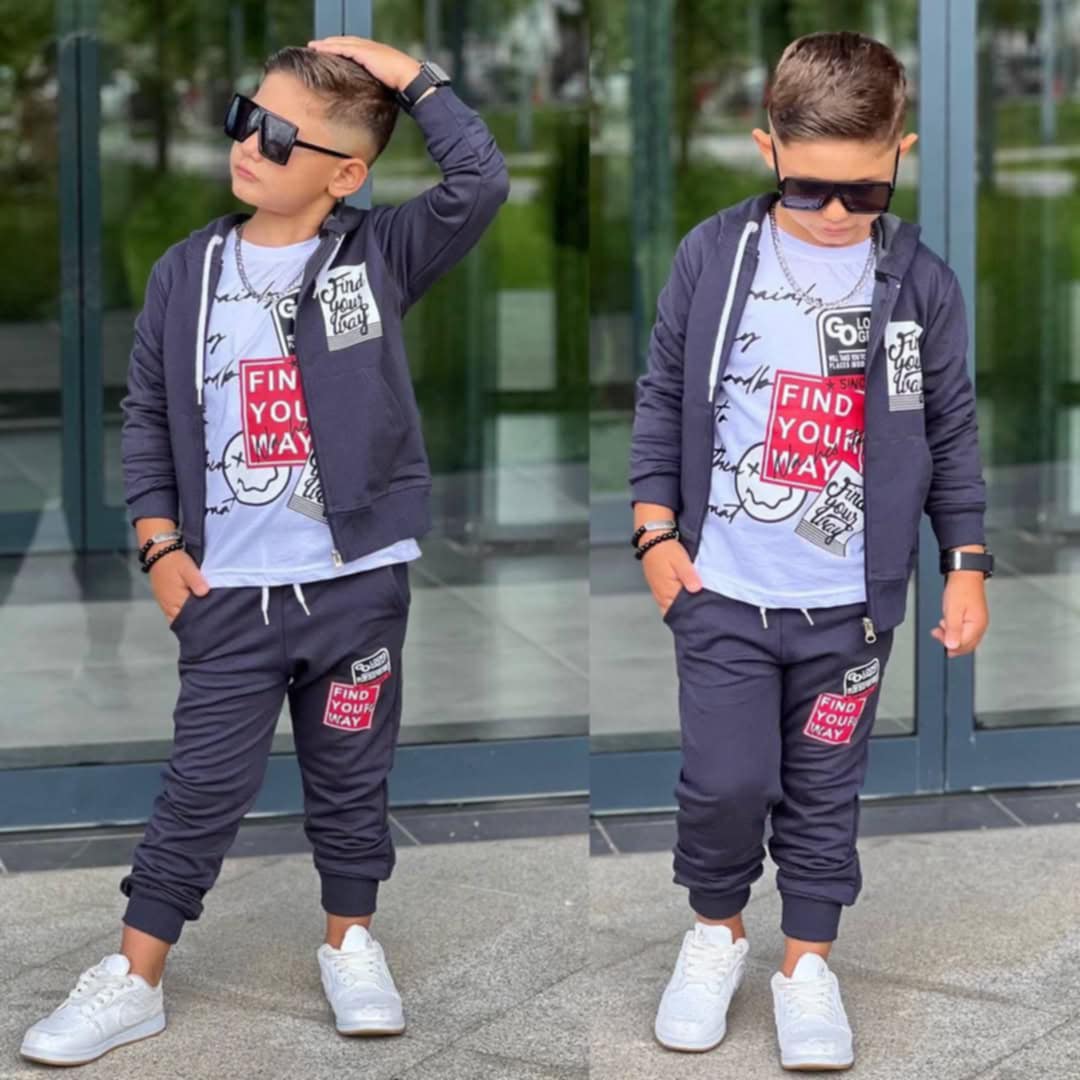 Efektowny chłopięcy komplet 3-częściowy. W zestawie biała bluzka na długi rękaw. Bluza z kapturem zasuwana jest na suwak i posiada kieszenie. Bluza ma ściągacze przy rękawkach i na dole. Spodnie posiadają dwie kieszenie, pas w gumkę i nogawki ze ściągaczami. Szeroki pas w gumkę z dodatkową regulacją-sznureczkami. Uroku całemu kompletowi dodają nadruki na bluzce, bluzie i spodniach. To model uszyty z przyjemnej, miękkiej dzianiny dresowej, nie krępującej ruchów chłopca.
