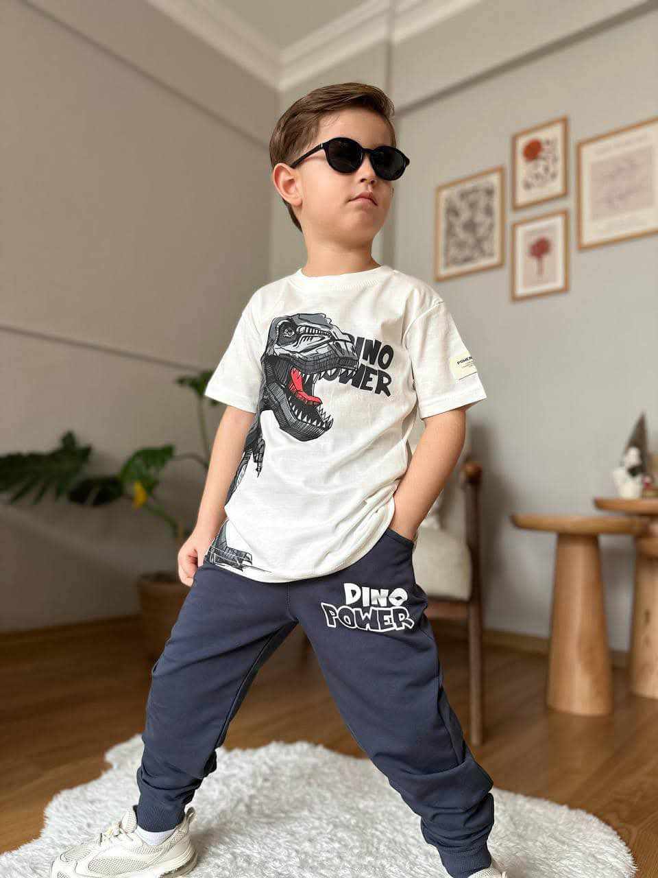 Modny chłopięcy komplet 2-częściowy. W zestawie śmietankowy t-shirt z grafitowym nadrukiem dinozaura Grafitowe spodnie posiadają dwie kieszenie, a w pasie wygodny, szeroki ściągacz. Dodatkowo mają sznurek do regulacji, aby spodenki utrzymywały się na swoim miejscu. Nogawki zakończone są ściągaczami. To model uszyty z przyjemnej, miękkiej dzianiny dresowej, nie krępującej ruchów chłopca. Jakość Premium!