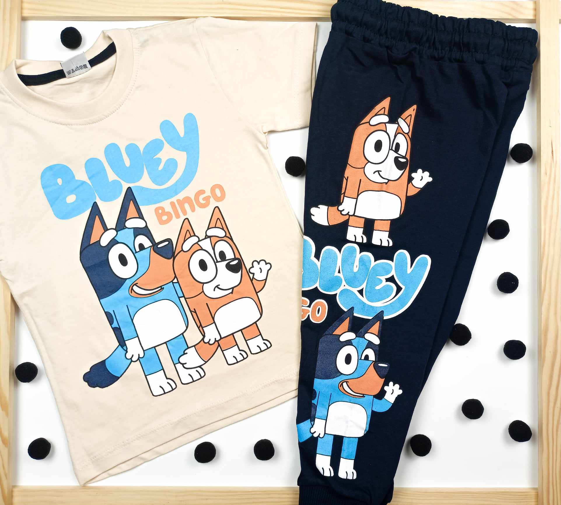 Efektowny chłopięcy komplet: t-shirt+spodnie dla fanów bajki Blue. Kremowa bluzka z krótkim rękawem ma klasyczny krój z okrągłym dekoltem. Oryginalności dodaje jej nadruk z bohaterkami: Blue i Bingo. Granatowe spodnie posiadają nogawki ze ściągaczami, szeroki pas w gumkę i nadruk głównych bohaterów. To model uszyty z przyjemnej, miękkiej bawełny, nie krępującej ruchów dziecka.