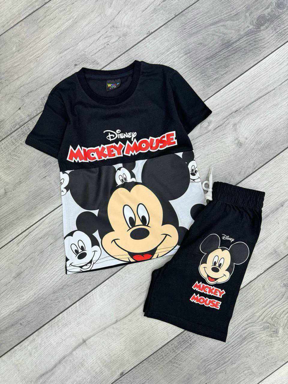Chłopięcy komplet dla fanów Myszki Miki. W zestawie czarno-biały t-shirt z nadrukiem MICKEY MOUSE. Czarne spodenki idealnie komponują się z bluzką. Szeroki pas w gumkę sprawia, że spodenki utrzymują się na swoim miejscu. To model uszyty z przyjemnej, miękkiej dzianiny dresowej, nie krępującej ruchów chłopca.