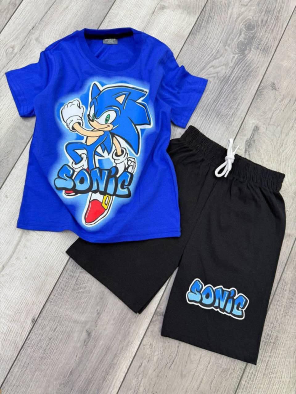 Chłopięcy komplet dla fanów bajki SONIC. W zestawie niebieski t-shirt z nadrukiem głównego bohatera. Czarne spodenki posiadają nadruk idealnie komponujący się z bluzką. Szeroki pas w gumkę sprawia, że spodenki utrzymują się na swoim miejscu. To model uszyty z przyjemnej, miękkiej dzianiny, nie krępującej ruchów chłopca.
