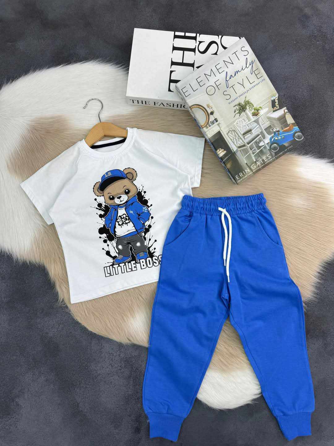 Modny chłopięcy komplet 2-częściowy. W zestawie biały t-shirt z nadrukiem Misia. Niebieskie spodnie posiadają dwie kieszenie, a w pasie wygodny, szeroki ściągacz. Dodatkowo mają sznurek do regulacji, aby spodenki utrzymywały się na swoim miejscu. Nogawki zakończone są ściągaczami. To model uszyty z przyjemnej, miękkiej dzianiny dresowej, nie krępującej ruchów chłopca.