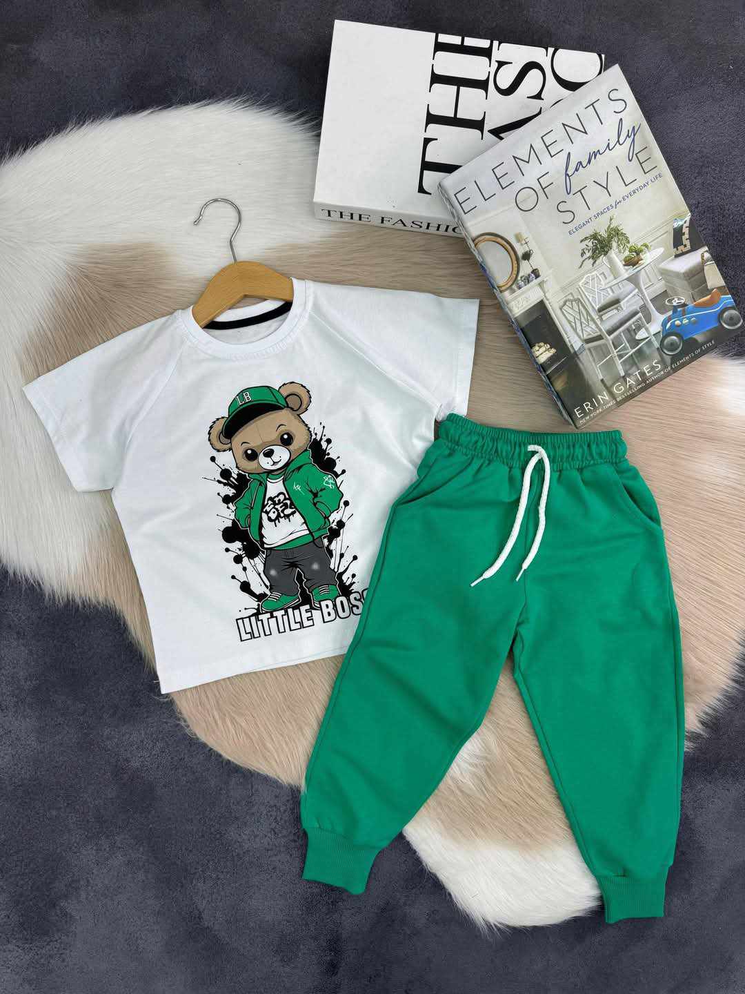 Modny chłopięcy komplet 2-częściowy. W zestawie biały t-shirt z nadrukiem Misia. Zielone spodnie posiadają dwie kieszenie, a w pasie wygodny, szeroki ściągacz. Dodatkowo mają sznurek do regulacji, aby spodenki utrzymywały się na swoim miejscu. Nogawki zakończone są ściągaczami. To model uszyty z przyjemnej, miękkiej dzianiny dresowej, nie krępującej ruchów chłopca.