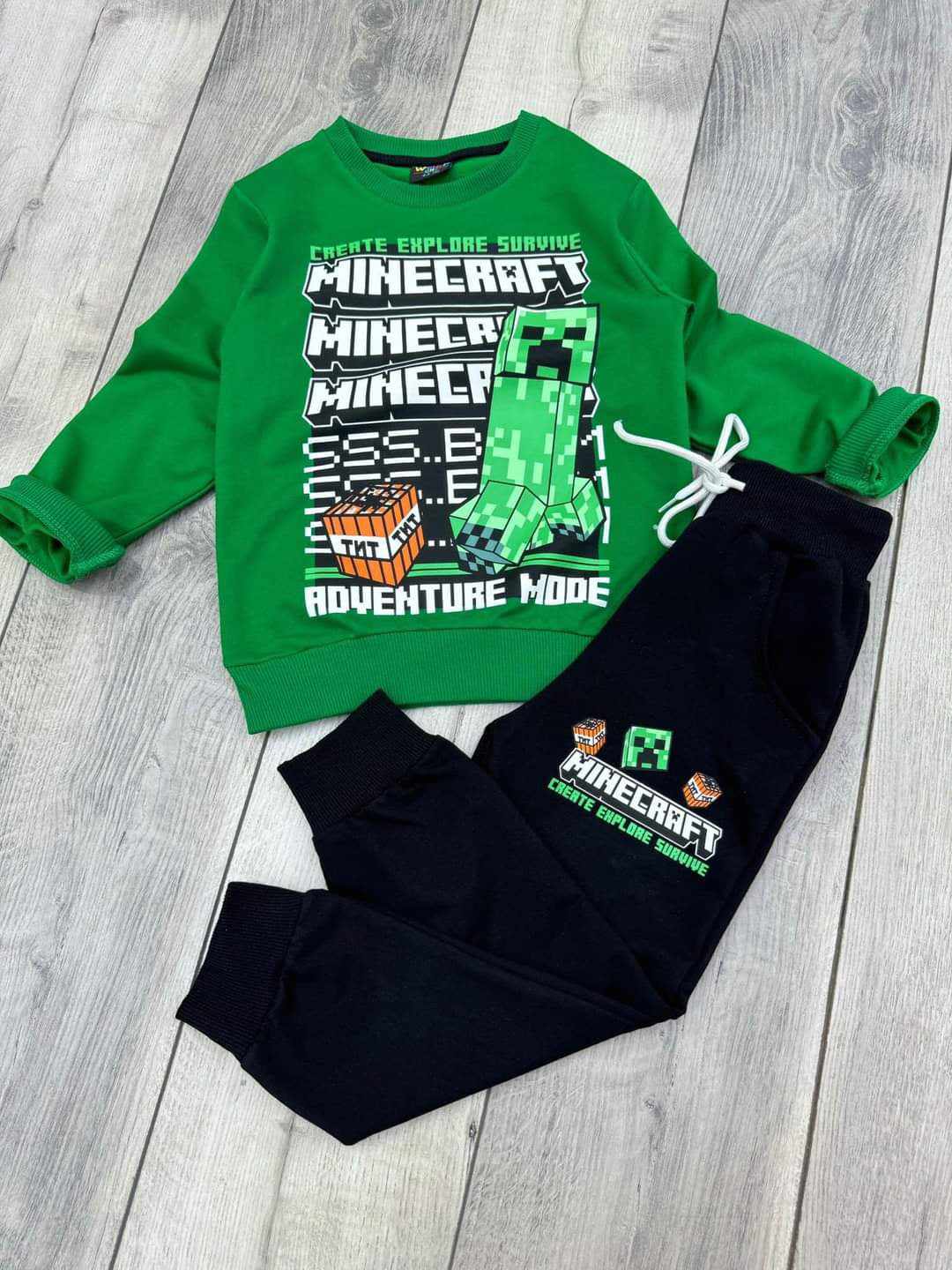 Efektowny chłopięcy komplet: bluza+spodnie dla fanów MINECRAFT. W zestawie zielona bluza z nadrukiem głównych bohaterów. Bluza ma klasyczny krój i wkładana jest przez głowę. Posiada ściągacz na dole i przy rękawkach. Czarne spodnie posiadają nogawki ze ściągaczami, szeroki pas w gumkę i nadruk, taki jak na bluzie. To model uszyty z przyjemnej, miękkiej bawełny, nie krępującej ruchów dziecka.
