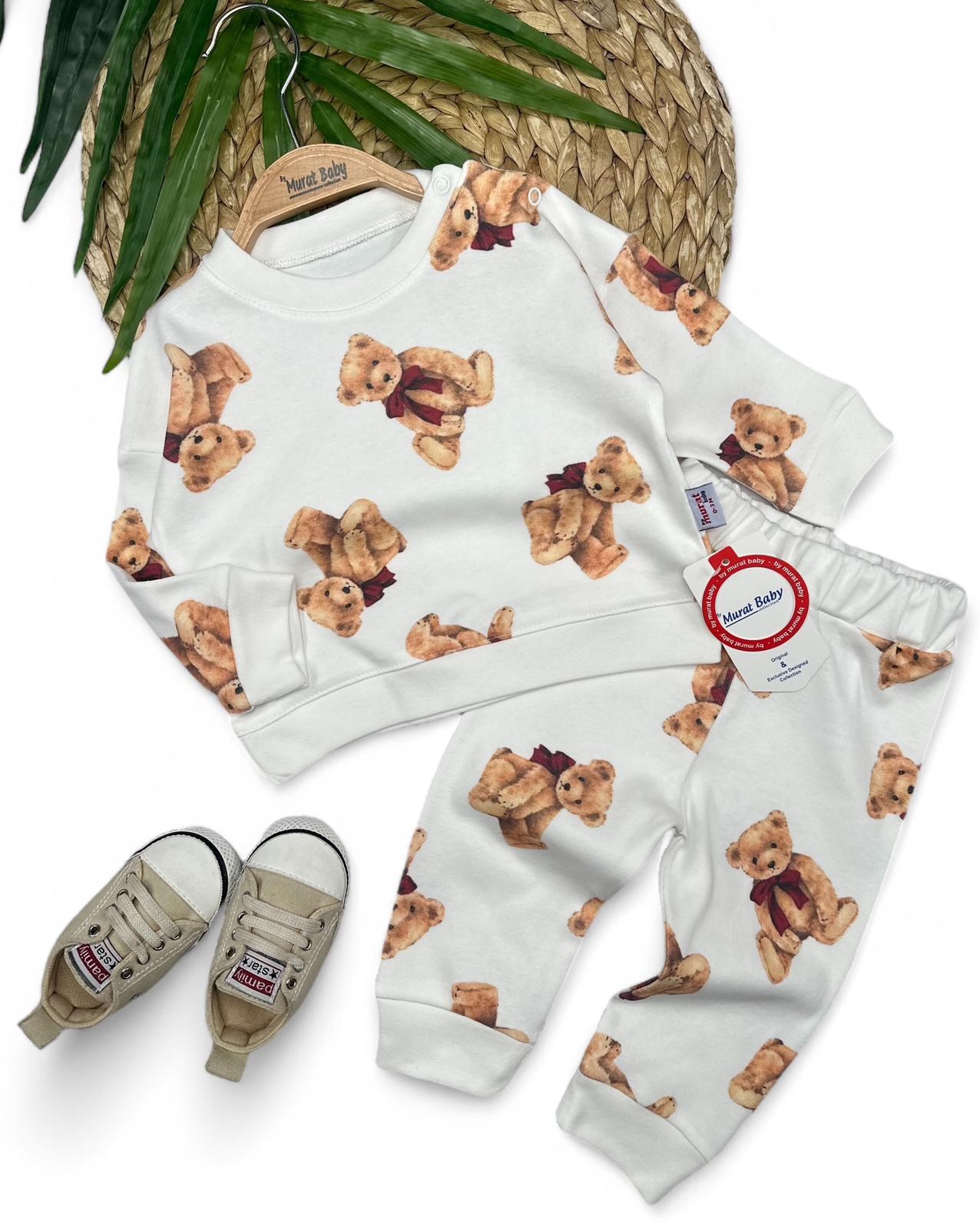 Prześliczny komplet 2-częściowy w kolorze białym/śmietankowym. Bluza wykończona jest ściągaczem na dole i przy rękawkach. Bluza ma klasyczny krój i wkładana jest przez głowę. Spodnie posiadają nogawki ze ściągaczami i pas w gumkę. Uroku całemu kompletowi nadają nadruki misiów na bluzie i na spodniach. To model uszyty z przyjemnej, miękkiej bawełny, nie krępującej ruchów dziecka.