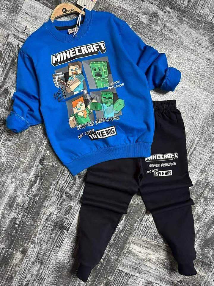 Chłopięcy komplet dla fanów MINECRAFT. W zestawie niebieska bluza z nadrukiem głównych bohaterów. Bluza ma klasyczny krój i wkładana jest przez głowę. Posiada ściągacz na dole i przy rękawkach. Granatowe spodnie posiadają nadruk MINECRAFT idealnie komponujący się z bluzą. Spodnie mają ściągacz przy nogawkach, a pas w gumkę sprawia, że spodnie utrzymują się na swoim miejscu. To model uszyty z przyjemnej, miękkiej dzianiny dresowej, nie krępującej ruchów chłopca.