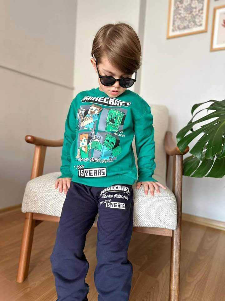 Chłopięcy komplet dla fanów MINECRAFT. W zestawie zielona bluza z nadrukiem głównych bohaterów. Bluza ma klasyczny krój i wkładana jest przez głowę. Posiada ściągacz na dole i przy rękawkach. Granatowe spodnie  posiadają nadruk MINECRAFT idealnie komponujący się z bluzą. Spodnie mają ściągacz przy nogawkach, a pas w gumkę sprawia, że spodnie utrzymują się na swoim miejscu. To model uszyty z przyjemnej, miękkiej dzianiny dresowej, nie krępującej ruchów chłopca.