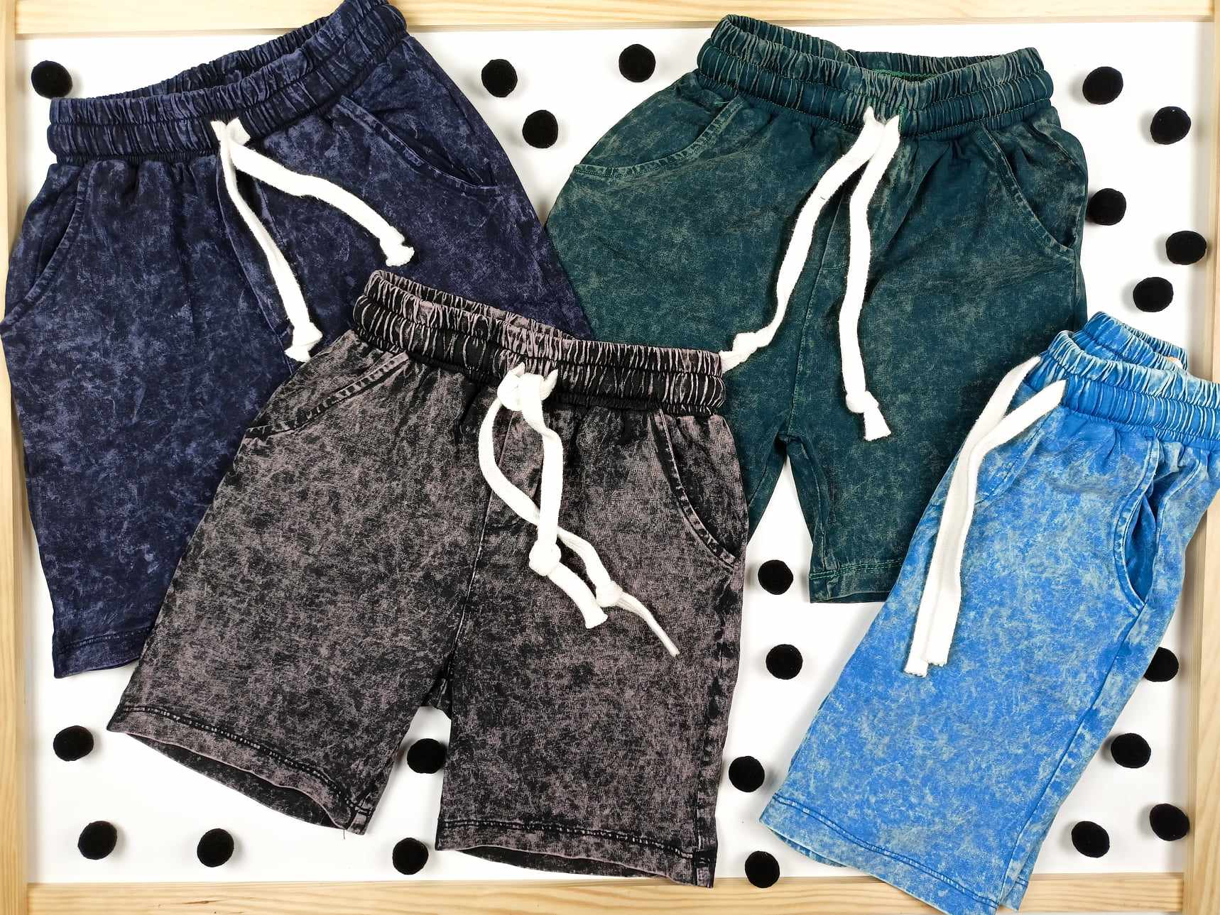 Krótkie spodenki/szorty dekatyzowane a'la jeans w czterech wariantach kolorystycznych: czarny, granatowy, niebieski, zielony. Z przodu posiadają dwie kieszenie, imitację rozporka, a w pasie wygodny, szeroki ściągacz. Dodatkowo mają sznurek do regulacji, aby spodenki utrzymywały się na swoim miejscu. Doskonale sprawdzą na co dzień, jak i do eleganckiej stylizacji.