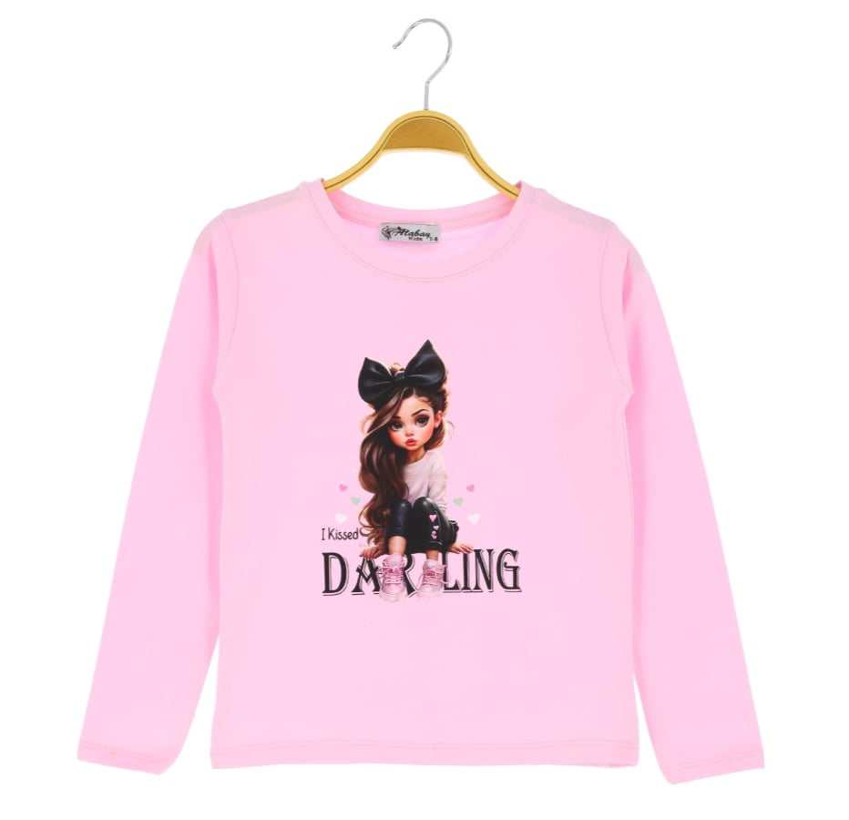 Piękna dziewczęca bluzeczka z długim rękawem. Jest to klasyczny krój z okrągłym dekoltem. Bluzka jest koloru jasnoróżowego, a przód został ozdobiony nadrukiem dziewczynki i napisem I kissed DARLING. To model uszyty z przyjemnej, miękkiej dzianiny, ładnie się uciąga, dzięki czemu dopasowuje się do dziecka, i zapewnia mu swobodę ruchów.