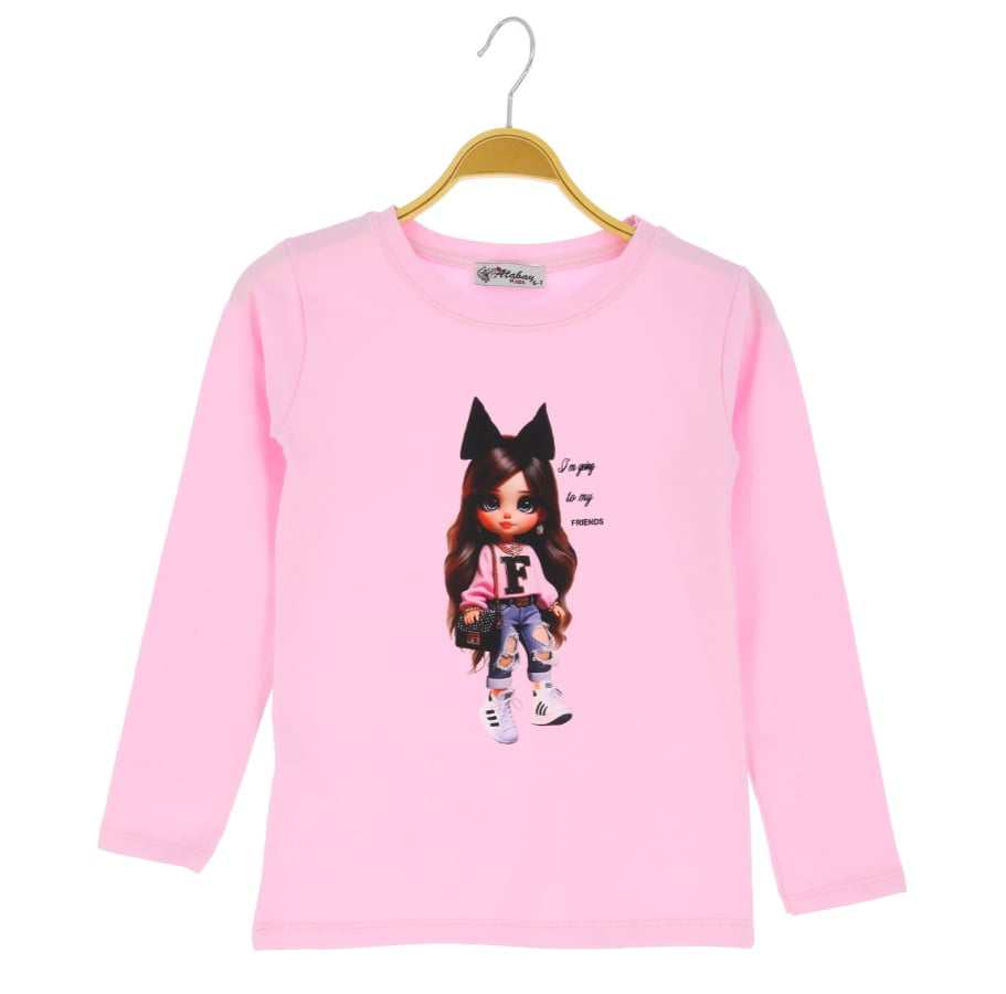 Piękna dziewczęca bluzeczka z długim rękawem. Jest to klasyczny krój z okrągłym dekoltem. Bluzka jest koloru jasnoróżowego, a przód został ozdobiony nadrukiem dziewczynki i napisem I'm going to my friends. To model uszyty z przyjemnej, miękkiej dzianiny, ładnie się uciąga, dzięki czemu dopasowuje się do dziecka, i zapewnia mu swobodę ruchów.