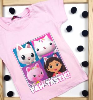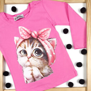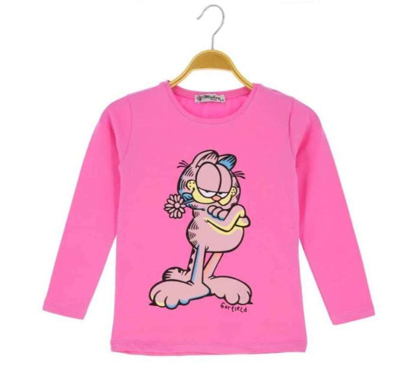 Piękna dziewczęca bluzeczka z długim rękawem. Jest to klasyczny krój z okrągłym dekoltem. Bluzka jest koloru różowego, a przód został ozdobiony nadrukiem Garfielda. To model uszyty z przyjemnej, miękkiej dzianiny, ładnie się uciąga, dzięki czemu dopasowuje się do dziecka, i zapewnia mu swobodę ruchów.