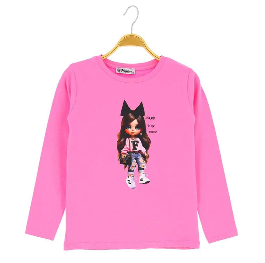 Piękna dziewczęca bluzeczka z długim rękawem. Jest to klasyczny krój z okrągłym dekoltem. Bluzka jest koloru różowego, a przód został ozdobiony nadrukiem dziewczynki i napisem I'm going to my friends. To model uszyty z przyjemnej, miękkiej dzianiny, ładnie się uciąga, dzięki czemu dopasowuje się do dziecka, i zapewnia mu swobodę ruchów.