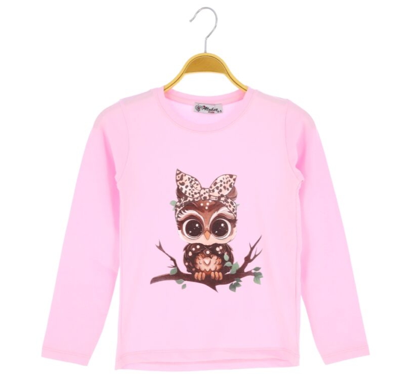Piękna dziewczęca bluzeczka z długim rękawem. Jest to klasyczny krój z okrągłym dekoltem. Bluzka jest koloru różowego, a przód został ozdobiony nadrukiem sowy. To model uszyty z przyjemnej, miękkiej dzianiny, ładnie się uciąga, dzięki czemu dopasowuje się do dziecka, i zapewnia mu swobodę ruchów.