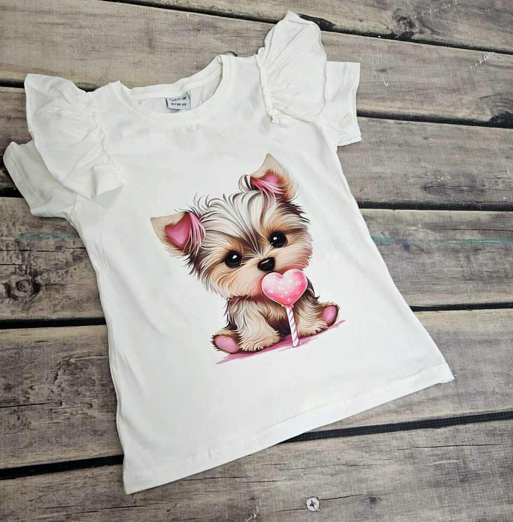 Piękny dziewczęcy t-shirt z krótkim rękawem. Jest to klasyczny krój z okrągłym dekoltem. Oryginalności dodaje jej  nadru przesłodkiego Yorka z lizakiem. Falbanki przy ramionkach dodają lekkości i dziewczęcego stylu. To model uszyty z przyjemnej, miękkiej bawłny, ładnie się uciąga, dzięki czemu dopasowuje się do dziecka i zapewnia mu swobodę ruchów.