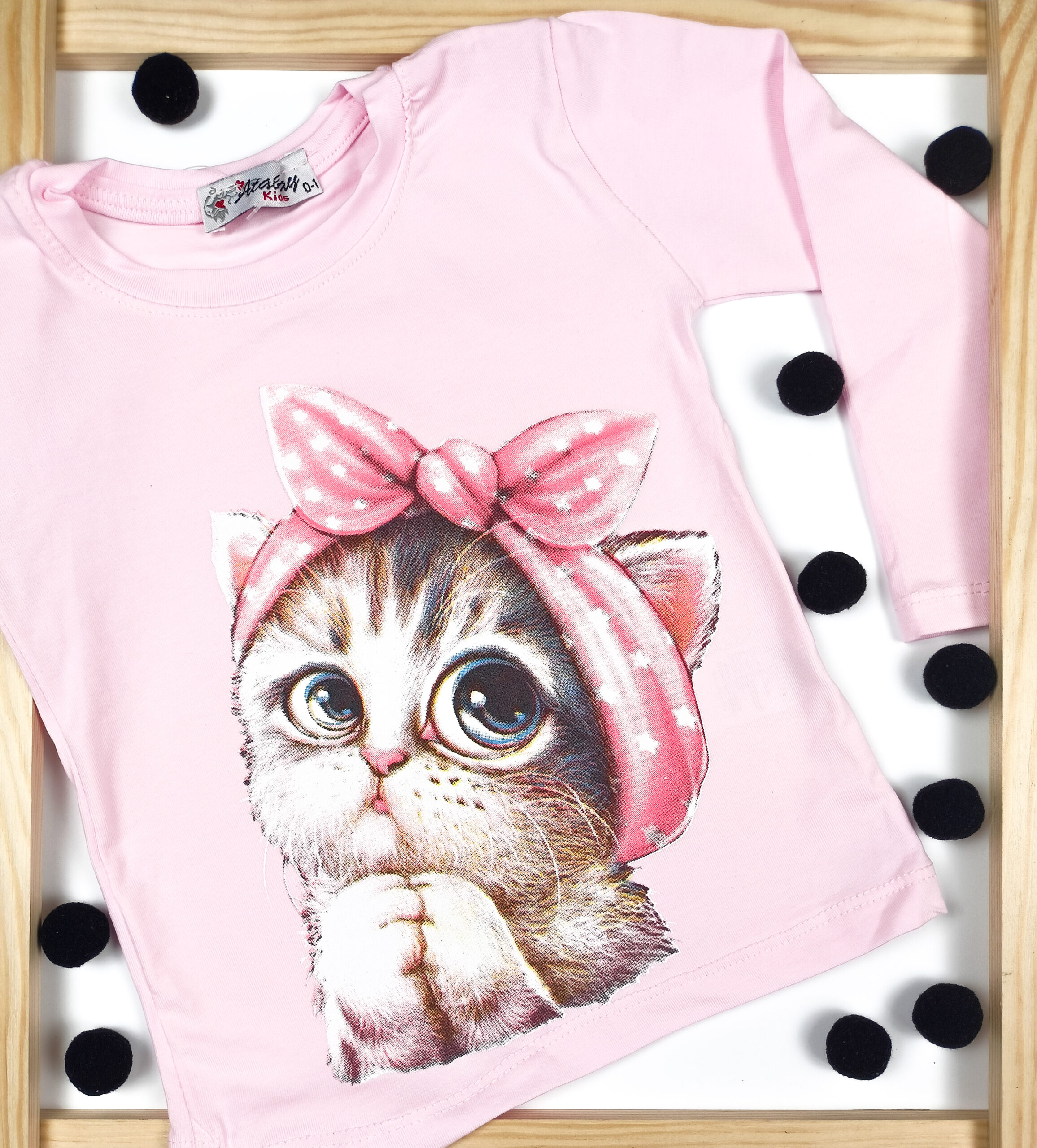 Piękna dziewczęca bluzeczka z długim rękawem. Jest to klasyczny krój z okrągłym dekoltem. Bluzka jest koloru różowego, a przód został ozdobiony słodkim nadrukiem kotka. To model uszyty z przyjemnej, miękkiej dzianiny, ładnie się uciąga, dzięki czemu dopasowuje się do dziecka, i zapewnia mu swobodę ruchów.