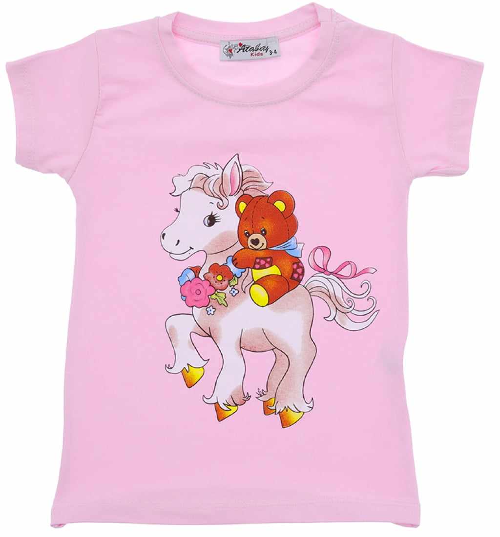 Piękna dziewczęca bluzeczka z krótkim rękawem w kolorze różowym. Jest to klasyczny krój z okrągłym dekoltem. Uroku bluzce nadaje nadruk misia na kucu. To model uszyty z przyjemnej, miękkiej dzianiny, ładnie się uciąga, dzięki czemu dopasowuje się do dziecka, i zapewnia mu swobodę ruchów.