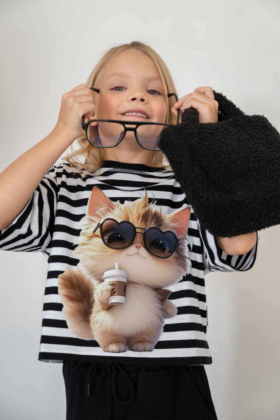 Piękny dziewczęcy t-shirt w paski z krótkim rękawem. Jest to klasyczny krój z okrągłym dekoltem. Oryginalności dodaje jej cyfrowy nadruk- zapewnia intensywne, głębokie kolory. To model uszyty z przyjemnej, miękkiej dzianiny, ładnie się uciąga, dzięki czemu dopasowuje się do dziecka i zapewnia mu swobodę ruchów.