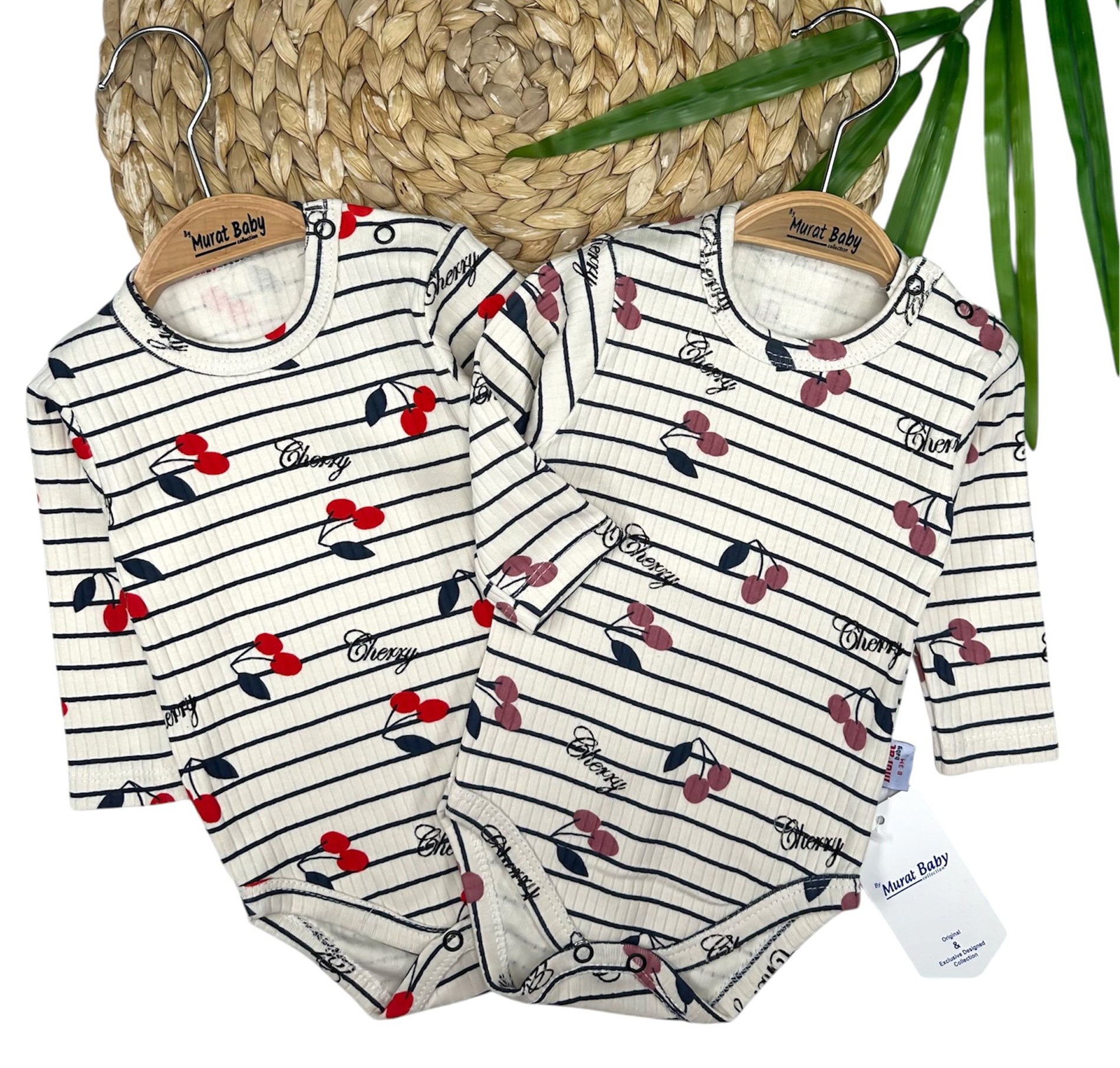 Urocze body z długim rękawem w kolorze kremowym w granatowe paski z materiału typu prążek. Body posiadają zapinanie na napki przy szyjce i w kroczku. Oryginalności dodaje im nadruk wiśni w dwóch wariantach kolorystycznych: wiśnie czerwone i wiśnie różowe. Body zapewnią dziecku wygodę, komfort i mogą być z powodzeniem stosowane jako baza do innych stylizacji. Nie może ich zabraknąć w garderobie maluszka! To model uszyty z przyjemnej, miękkiej bawełny, nie krępującej ruchów dziecka.