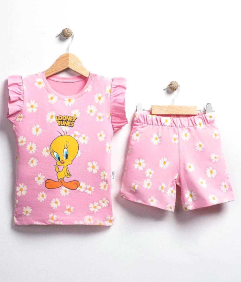Wygodny, letni komplet 2-częściowy w kolorze różowym. W zestawie bluzka z krótkim rękawem z nadrukiem Tweety-ego. Falbanki przy ramionach dodają lekkości i podkreślają dziewczęcy styl. Spodenki mają pas w gumkę i nadruk kwiatków idealnie komponujący się z t-shirtem. To model uszyty z miękkiej, cienkiej bawełny, nie krępującej ruchów dziecka.