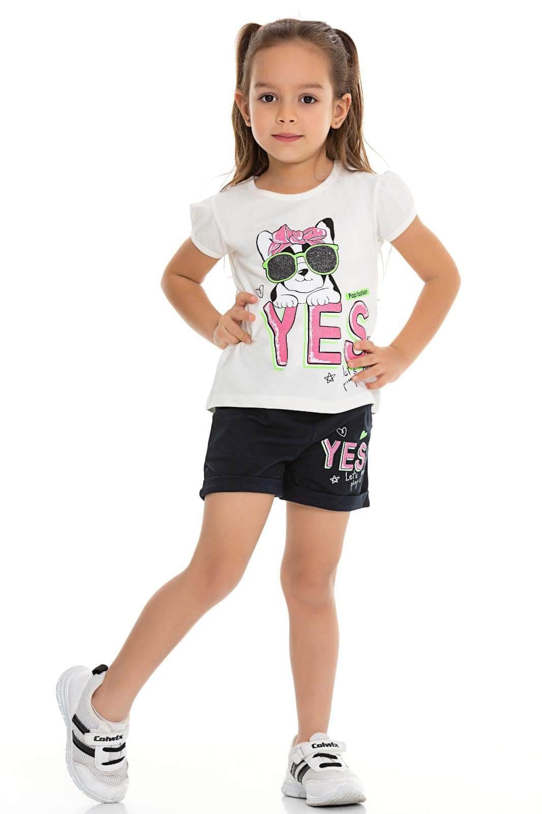 Komplet 2-częściowy dla dziewczynki. Biały t-shirt posiada delikatne bufki przy rękawach. Tył bluzki delikatnie dłuższy o około 2 cm. Uroku bluzeczce dodaje nadruk pieska z połyskującym brokatem. Krótkie spodenki mają pas w gumkę i są koloru czarnego/granatowego. Posiadają dwie kieszenie i nadruk YES- taki sam jak na bluzeczce. Uroku szortom dodaje kokardka na środku. To model uszyty z przyjemnej bawełny, nie krępującej ruchów dziecka.