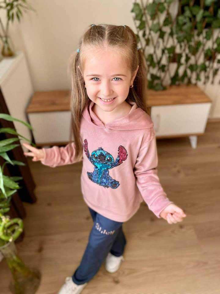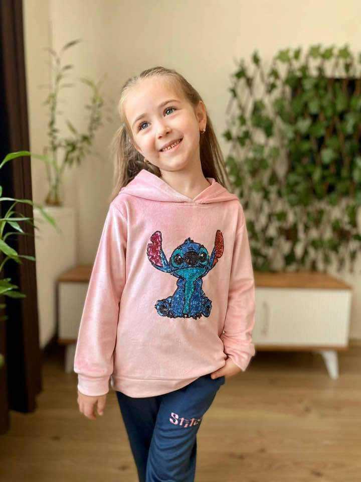 Efektowny welurowy dres: bluza+spodnie dla fanek bajki Stitch. Bluza z kapturem wykończona jest ściągaczem na dole i przy rękawkach. Bluza jest w kolorze brudnego różu. Ma klasyczny krój i wkładana jest przez głowę. Uroku dodaje jej cekinowy Stitch na brzodzie. Granatowe spodnie typu dzwony mają  pas w gumkę i dwie kieszenie. Dres jest miły w dotyku i stanowi doskonałe połączenie komfortu i stylu. Wyjątkowo modny i wygodny strój. Przypadnie do gustu każdej dziewczynce.